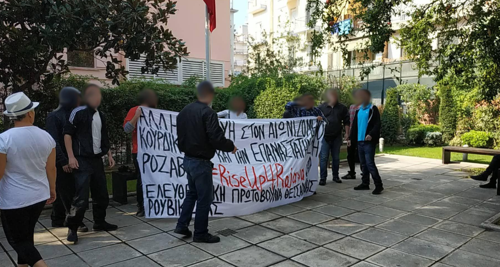 Είχε προηγηθεί λίγες ώρες νωρίτερα η διαμαρτυρία 12 ατόμων (11 άνδρες και μία γυναίκα) στον αύλειο χώρο του προξενείου της Τουρκίας, που συνελήφθησαν διότι ξεδίπλωσαν πανό ενάντια στις στρατιωτικές επιχειρήσεις στη Συρία, φωνάζοντας συνθήματα αλληλεγγύης στον κουρδικό λαό. Η δικογραφία που σχηματίστηκε εις βάρος τους αφορά τα πλημμελήματα της διατάραξης οικιακής ειρήνης και της έκθεσης σε κίνδυνο αντιποίνων (άρθρο 141 Π.Κ.).