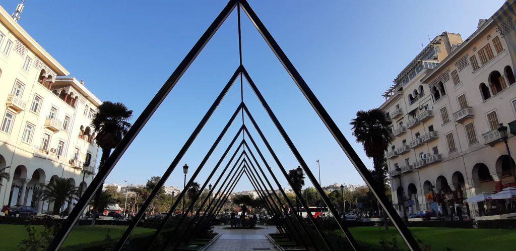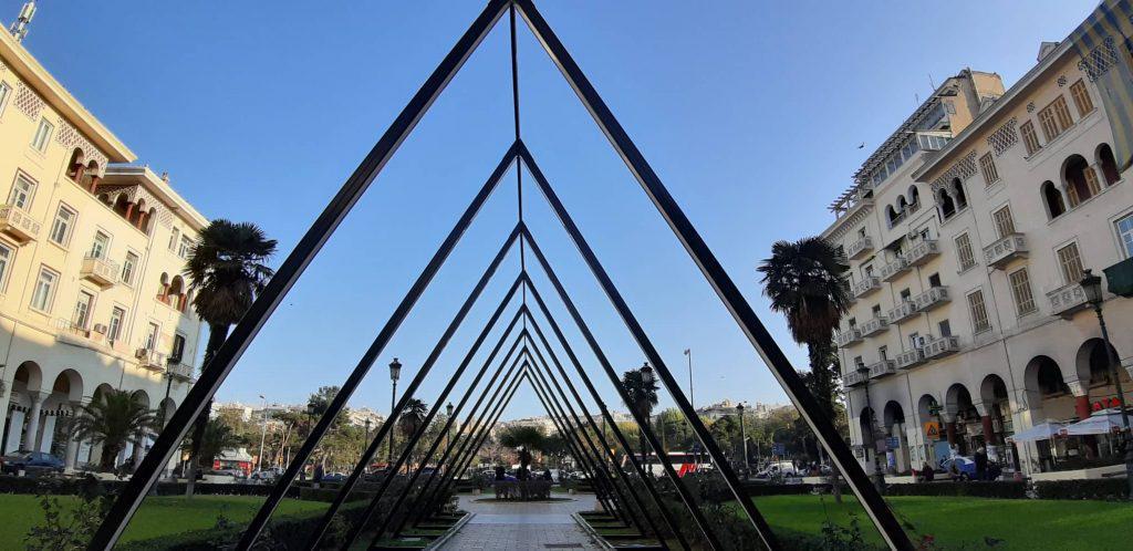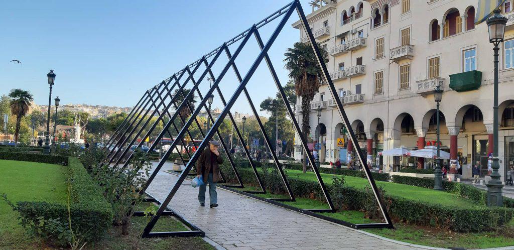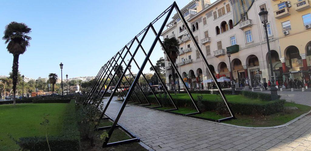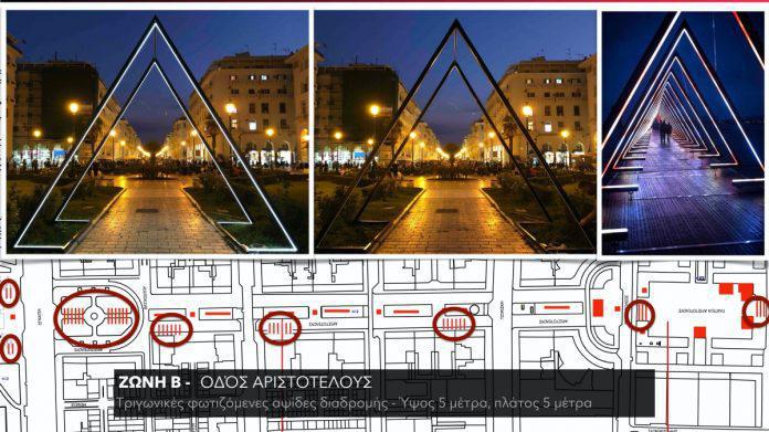 Πρόκειται για το installation που αναμένεται να δείξει αρκετά εντυπωσιακό όταν φωταγωγηθεί. Σύμφωνα με το πλάνο, τα τρίγωνα ανήκουν στον 2ο άξονα του σχεδιασμού που έχει να κάνει με μία διαδρομή που θα ξεκινά από την Λ. Νίκης έως και την Εγνατία. Ετοιμάζονται διάφορα selfie points γλυπτών και installation ούτως ώστε να παρακινούνται οι επισκέπτες και κάτοικοι να περπατήσουν όλη τη διαδρομή από ή προς την Χριστουγεννιάτικη Αγορά. Ο διάκοσμος της Ζώνης Β είναι ο αισθητικός συνδετικός κρίκος του χαρακτήρα του άξονα της Αριστοτέλους.
