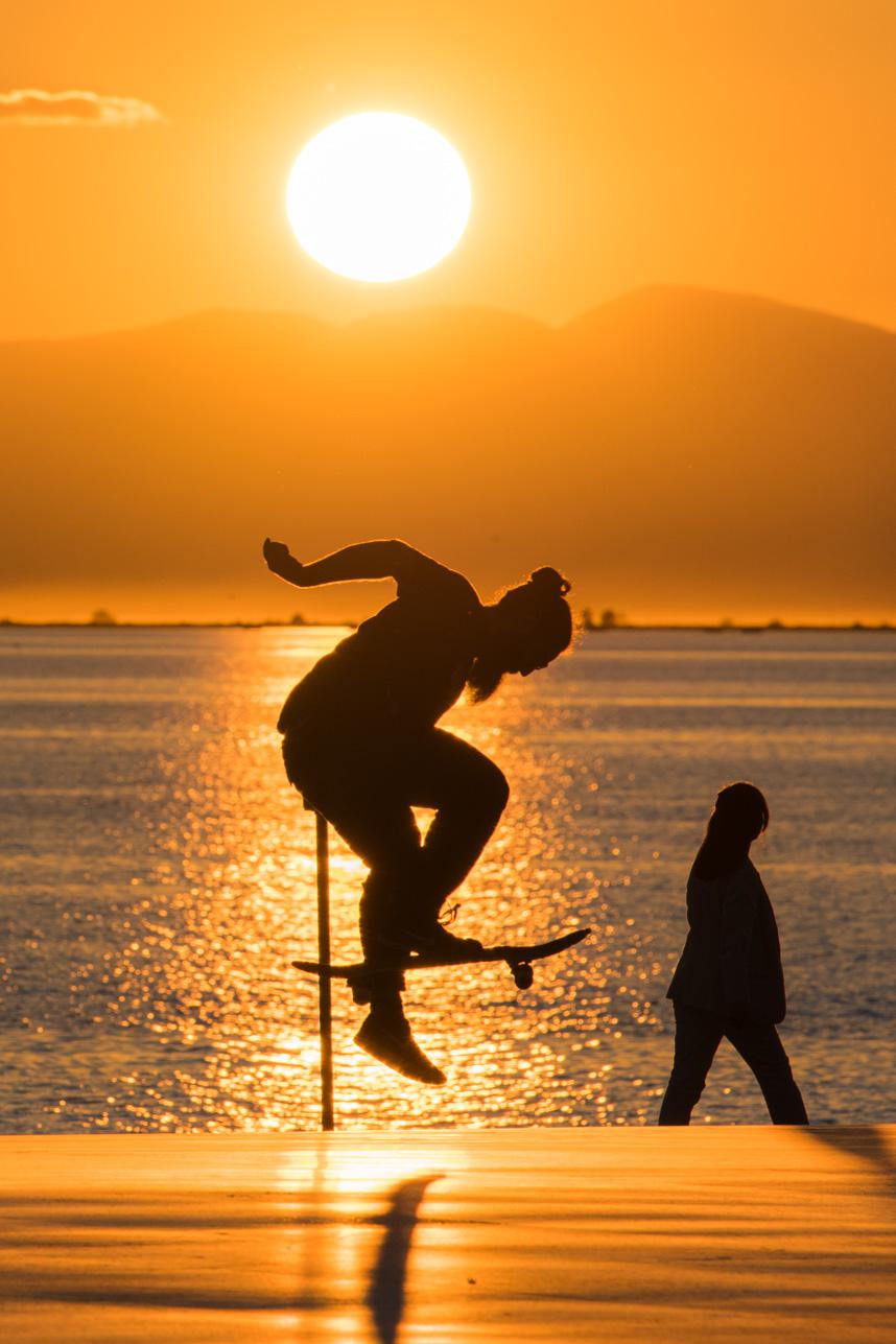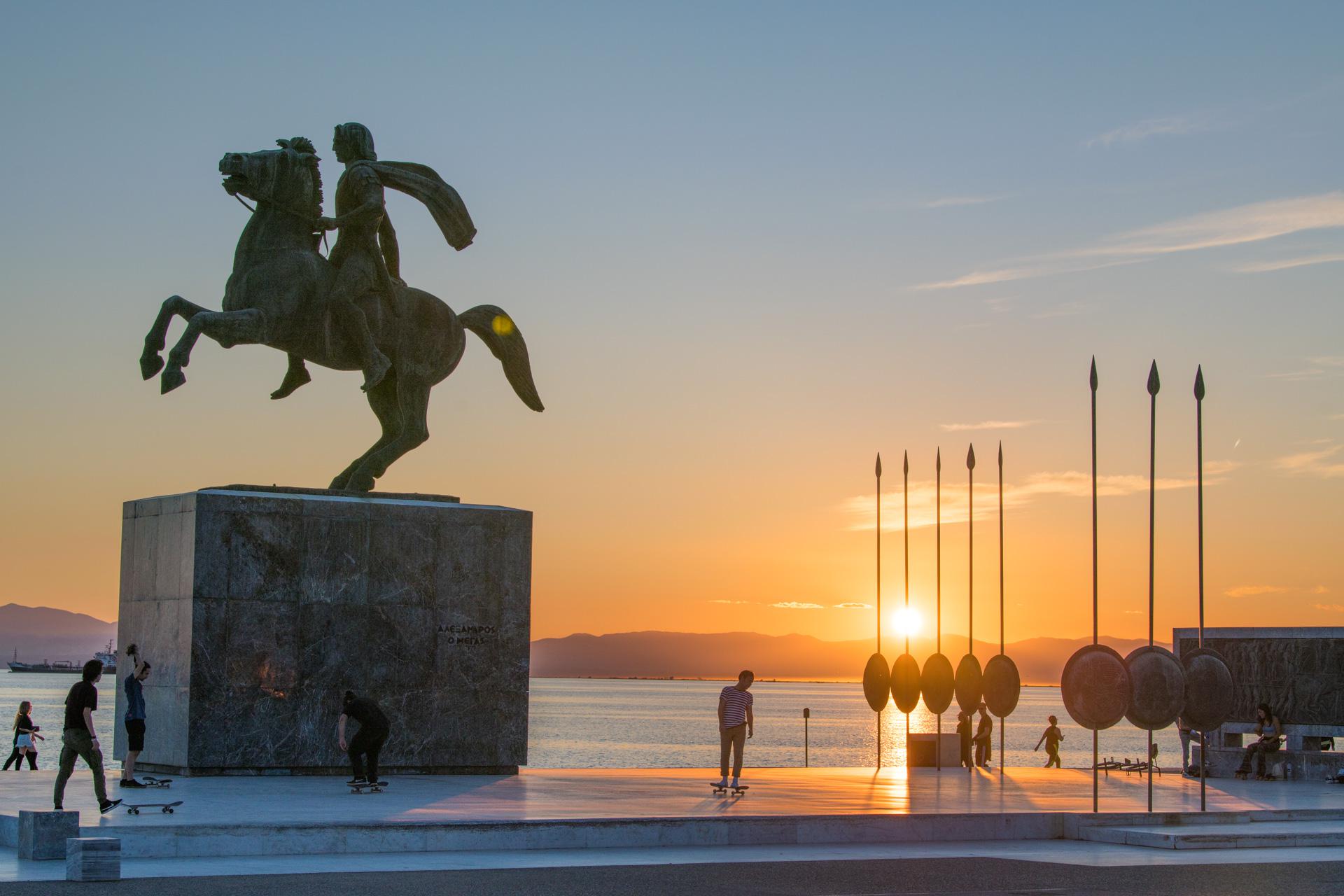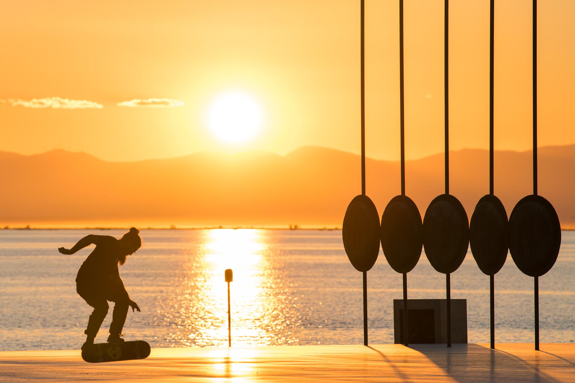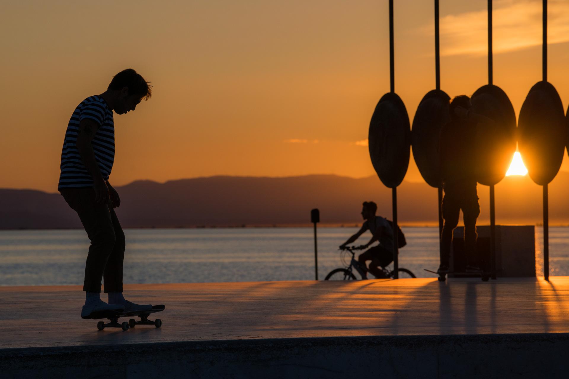 Περπατώντας παραλιακά προς το άγαλμα του Μέγα Αλέξανδρου τις απογευματινές ώρες κυρίως την στιγμή που ο ήλιος βουτά στην θάλασσα και τα πορφυρά χρώματα έρχονται στην επιφάνεια του ουρανού, εκεί μπορείς να βρεις πολλά νέα παιδιά με τα πατίνια τους.