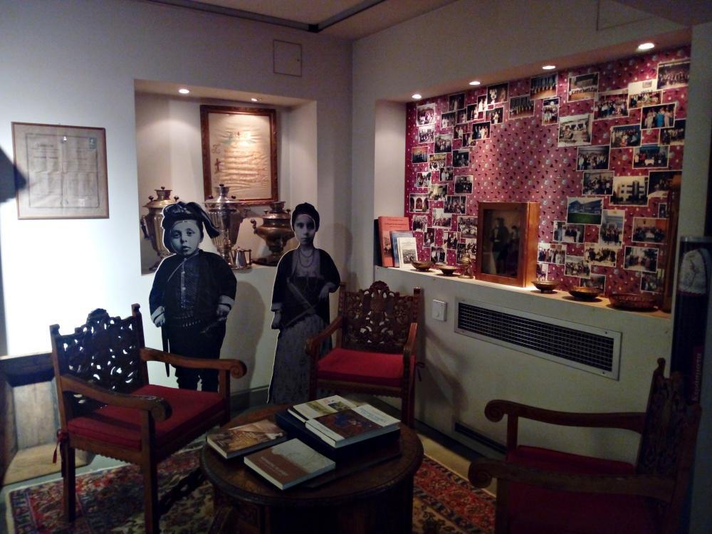 Αρχικά, βρισκόμαστε μπροστά σε μία βιτρίνα με φορέματα. «Σε αυτήν εδώ την βιτρίνα με τα ακριβά φορέματα, θέλουμε να δείξουμε ότι αυτές οι κυρίες είχαν την οικονομική δυνατότητα να ταξιδεύουν. Δηλαδή με λίγα λόγια, το μουσείο δεν δείχνει τον πόνο και τη φτώχεια της εποχής» εξηγεί. «Αντιθέτως, δείχνει τους αστούς και μεγαλοαστούς της Τραπεζούντας».
