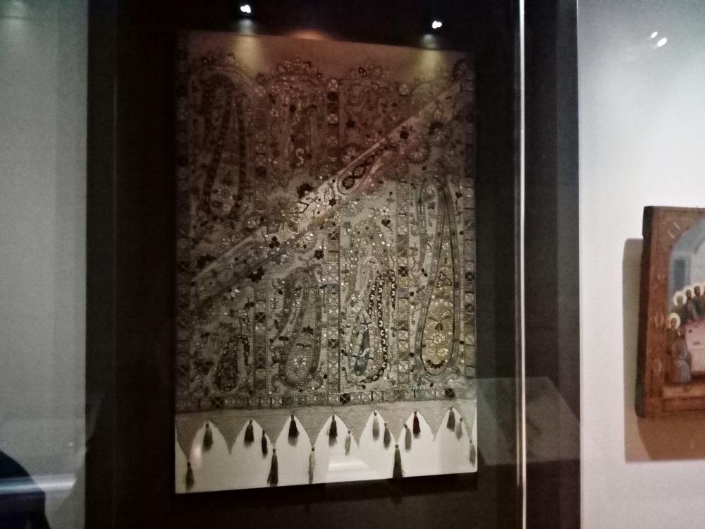 Στην τέταρτη ενότητα, βρίσκεται το παλαιότερο ίσως αντικείμενο της έκθεσης, που είναι ένα παραπέτασμα από κάποιο εικονοστάσι, το οποίο είναι όλο κεντημένο στο χέρι.