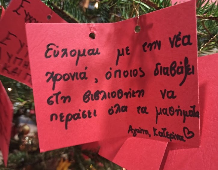 Στα κλαδιά του, λοιπόν, κρέμονται πάνω από 1.000 κάρτες στις οποίες οι φοιτητές αποτυπώνουν τις ευχές τους που είναι πάνω από όλα γεμάτες φαντασία και αγάπη, χωρίς ωστόσο να κρύβουν και το άγχος για τις υποχρεώσεις της ακαδημαϊκής τους καθημερινότητας.