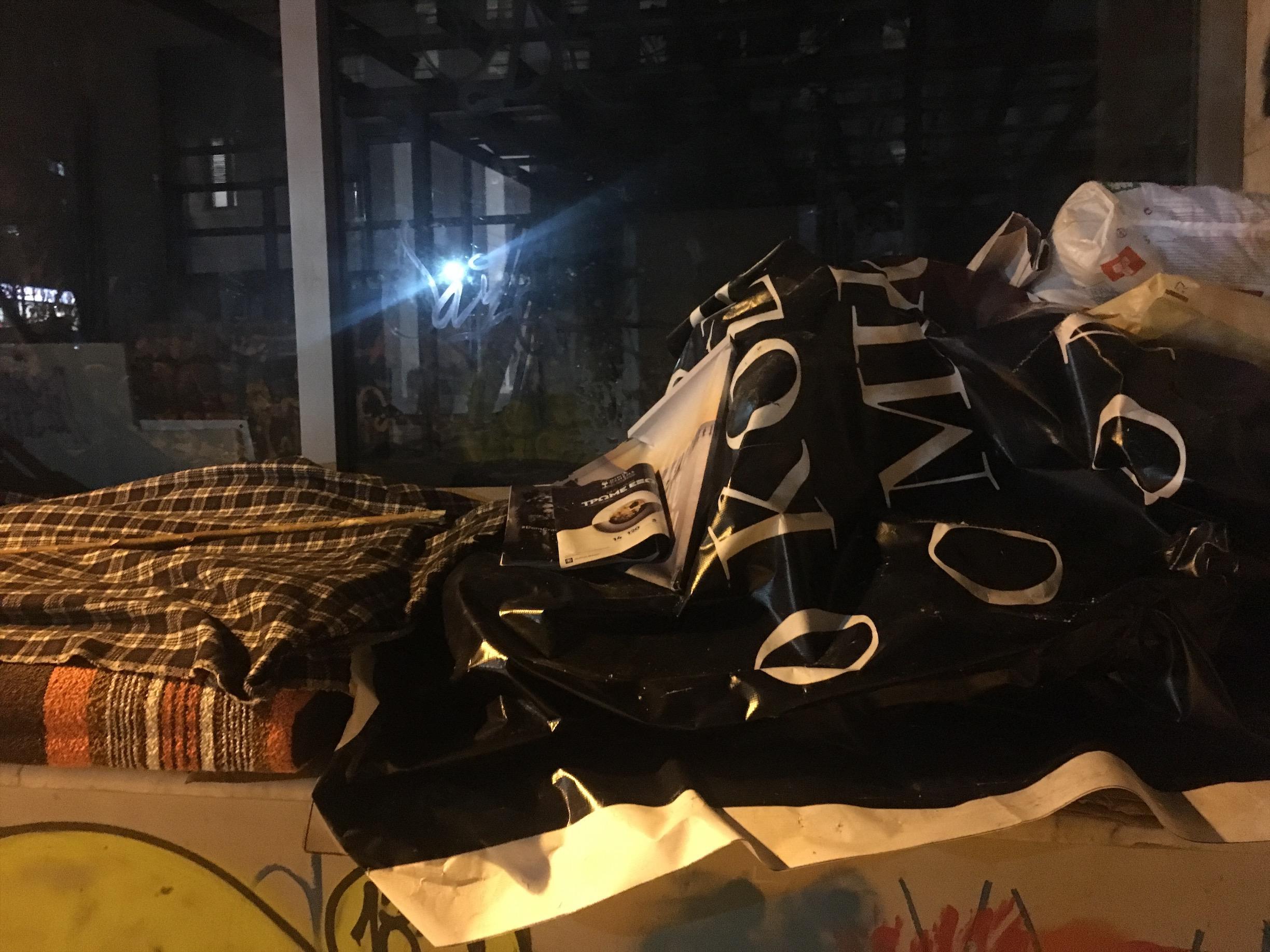Στην οδό Τσιμισκή 136 εδώ και αρκετό καιρό τις νύχτες συναντάς αυτή την εικόνα. Πλάι στα γραφεία της ΔΕΗ και σε εμπορικά καταστήματα. Στο συγκρότημα που ανήκει στη ΧΑΝΘ. Στα παράθυρα του κτιρίου έχουν τοποθετηθεί από άστεγους αρκετά ρούχα, κουβέρτες, πλαστικά μπουκάλια και ό,τι μπορεί να φανεί χρήσιμο στη καθημερινή τους ζωή. Το πορτοκαλί φως από τις κολώνες κάνει ορατό το δράμα των αόρατων αυτών ανθρώπων.