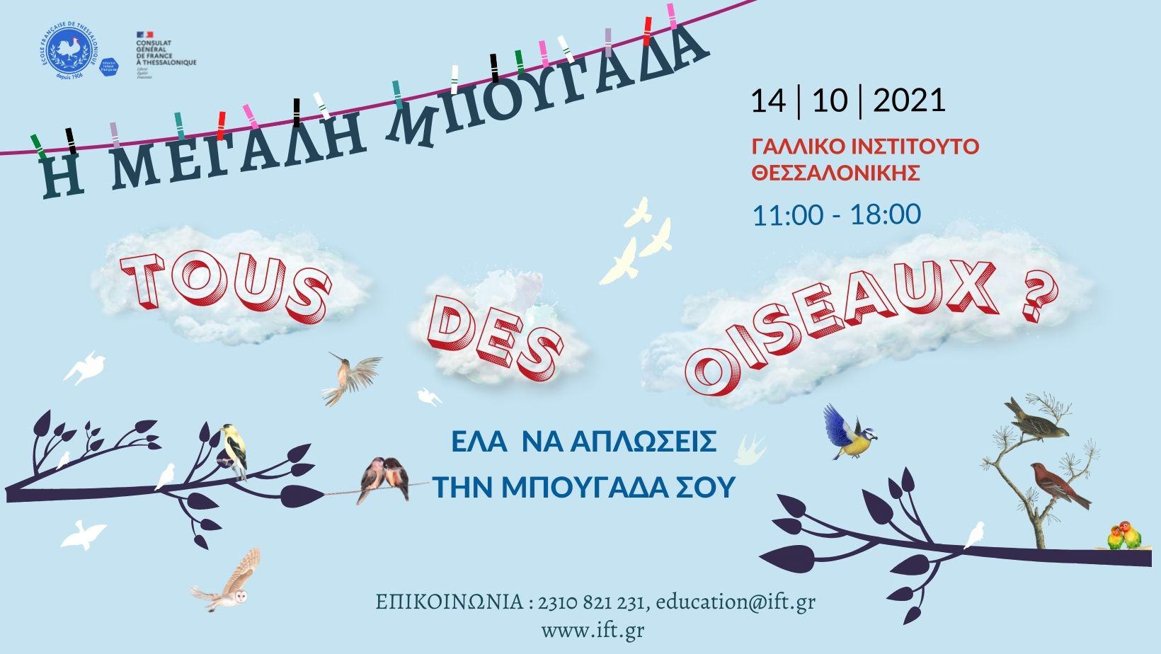 Το Γαλλικό Σχολείο Θεσσαλονίκης, σε συνεργασία με το Γαλλικό Ινστιτούτο Θεσ/νίκης και το Γενικό Προξενείο της Γαλλίας απλώνει μπουγάδα την Πέμπτη 14 Οκτωβρίου 2021, δημιουργώντας το απόλυτο αίσθημα ελευθερίας και φυσικά χρειάζεται την βοήθεια σου. Προσοχή, δεν χρειάζεται να είσαι καλλιτέχνης για να συμμετέχεις.