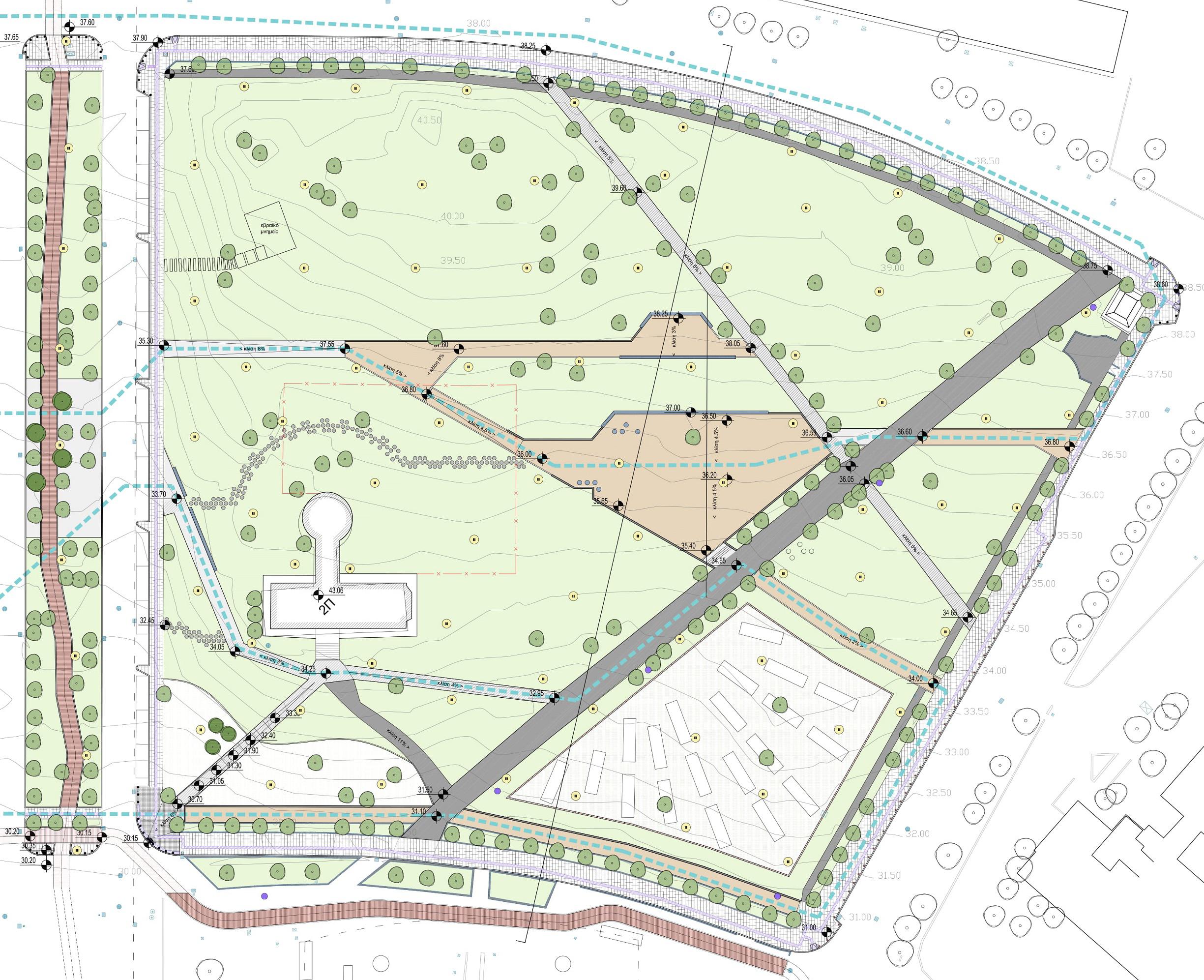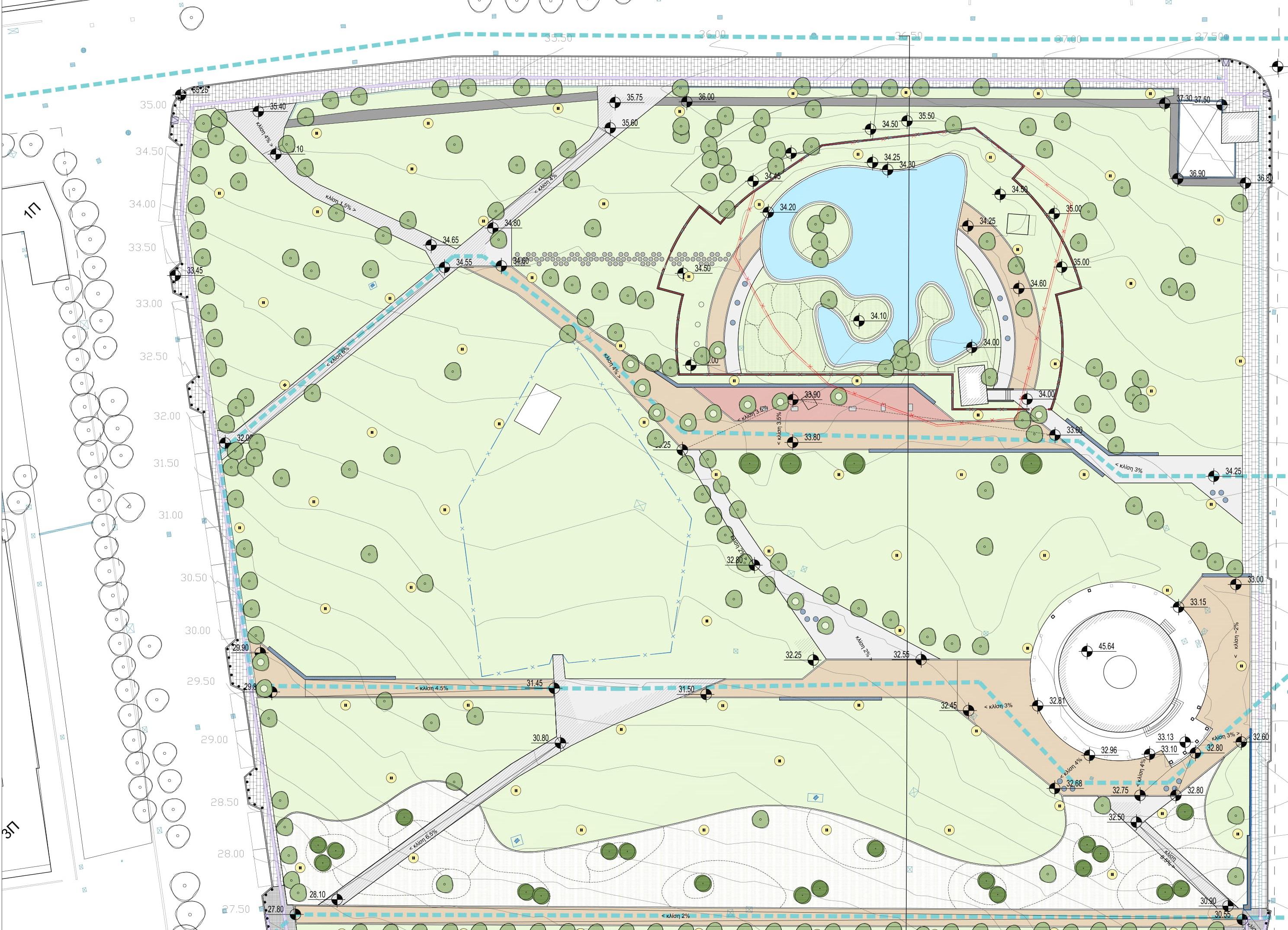 - Ο ποτισμός του πάρκου των δύο τεμαχίων θα γίνεται μέσω υπόγειας συγκέντρωσης νερών από κτίρια τα οποία θα στέλνονται στη λίμνη.