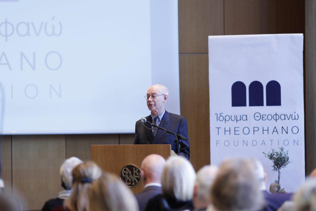 Στην ανάγκη στήριξης του θεσμού της Ευρωπαϊκής Ένωσης αναφέρθηκε στην ομιλία του ο Herman van Rompuy, χαρακτηρίζοντας την ΕΕ ως “το μεγαλύτερο ειρηνευτικό πρότζεκτ όλων των εποχών” γι’ αυτό και θα πρέπει, όπως είπε, να την προάγουμε και να την υπερασπιζόμαστε περισσότερο, “όχι μόνο με λόγια αλλά και με πράξεις”. Διευκρίνισε, δε, ότι αυτό πρέπει να γίνει “τόσο αναλαμβάνοντας την ευθύνη, για παράδειγμα για υγιή δημόσια οικονομικά, για το κλίμα και το περιβάλλον, αλλά αντιστοίχως και επιδεικνύοντας αλληλεγγύη”. “Χρειαζόμαστε και τις δύο αυτές αξίες, την ευθύνη και την αλληλεγγύη. Χωρίς αυτές δεν υπάρχει βιώσιμη σταθερότητα”, ανέφερε χαρακτηριστικά ο πρώην πρόεδρος του Ευρωπαϊκού Συμβουλίου, υπενθυμίζοντας ότι “η βάση του πολιτισμού μας είναι ο ανθρωπισμός, ο άνθρωπος ως μέτρο για τα πάντα”. Ο Herman van Rompuy αναφέρθηκε και στην ανάγκη “η Ένωση να είναι και να παραμείνει ένωση”, υπογραμμίζοντας πως “χρειαζόμαστε την ΕΕ για να λύσουμε τα μεγάλα ζητήματα της εποχής μας” καθώς “αν αποδυναμώσουμε την Ευρώπη, θα αυξήσουμε τα προβλήματα”. “Αν δεν επιτύχουμε στη μάχη μας απέναντι στην ανεργία, την παράτυπη μετανάστευση, την κλιματική αλλαγή, την τρομοκρατία, τις τεράστιες ανισότητες, την στρατιωτική ανασφάλεια, εάν δεν κατορθώσουμε να επιτύχουμε την επιθυμητή μεγαλύτερη προστασία απέναντι σ’ αυτές τις απειλές, τότε θα πέσουμε στη δίνη του προστατευτισμού και του στυγνού εθνικισμού. Θα πρέπει να δώσουμε στους ανθρώπους ένα μέρος, όπου είναι ασφαλείς και προστατευμένοι όπως σ’ ένα σπίτι. Αν δεν το κάνουμε αυτό, οι ίδιοι οι πολίτες θα απορρίψουν αυτό τον χώρο”, είπε χαρακτηριστικά. Ο πρώην πρόεδρος του Ευρωπαϊκού Συμβουλίου αναφέρθηκε επίσης στους συμβολισμούς του βραβείου αλλά και στην Αυτοκράτειρα Θεοφανώ ως “γέφυρα” μεταξύ Ανατολής και Δύσης, μεταξύ του αρχαίου και του σύγχρονου πολιτισμού, επισημαίνοντας, μεταξύ άλλων, ότι “περισσότερο από ποτέ, η εποχή μας χρειάζεται γέφυρες, να ξεπεράσουμε τις αντιξοότητες και την πόλωση”.
