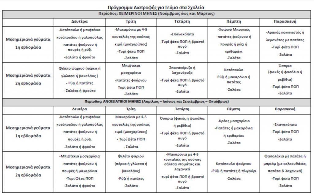 Το μενού των σχολικών γευμάτων αφορά στις πέντε εκπαιδευτικές ημέρες της εβδομάδας και είναι ειδικά σχεδιασμένο από πανεπιστημιακό φορέα, ώστε να καλύπτει τις διατροφικές ανάγκες των μαθητών στο πλαίσιο της υγιεινής μεσογειακής διατροφής. Διαφοροποιείται κυκλικά ανά δύο εβδομάδες και προσαρμόζεται σε «χειμερινό» και «ανοιξιάτικο» με βάση την εποχικότητα των λαχανικών και φρούτων.