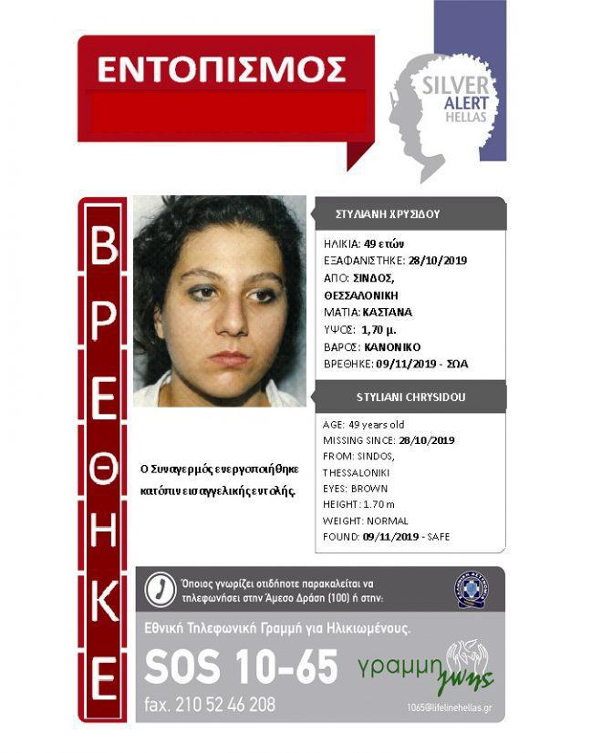 Η υπηρεσία Silver Alert, το μεσημέρι της 09/11/2019, λίγες ώρες μετά την ενεργοποίηση του κοινωνικού συναγερμού, έλαβε κλήση για την ανεύρεσή της. Πολίτης, που είχε δει το SILVER ALERT, εντόπισε την αναζητούμενη, περιπλανώμενη στο κέντρο της Θεσσαλονίκης. Ειδοποιήθηκαν οι συγγενείς και η ΕΛ.ΑΣ. και η γυναίκα επέστρεψε στην οικογένειά της!