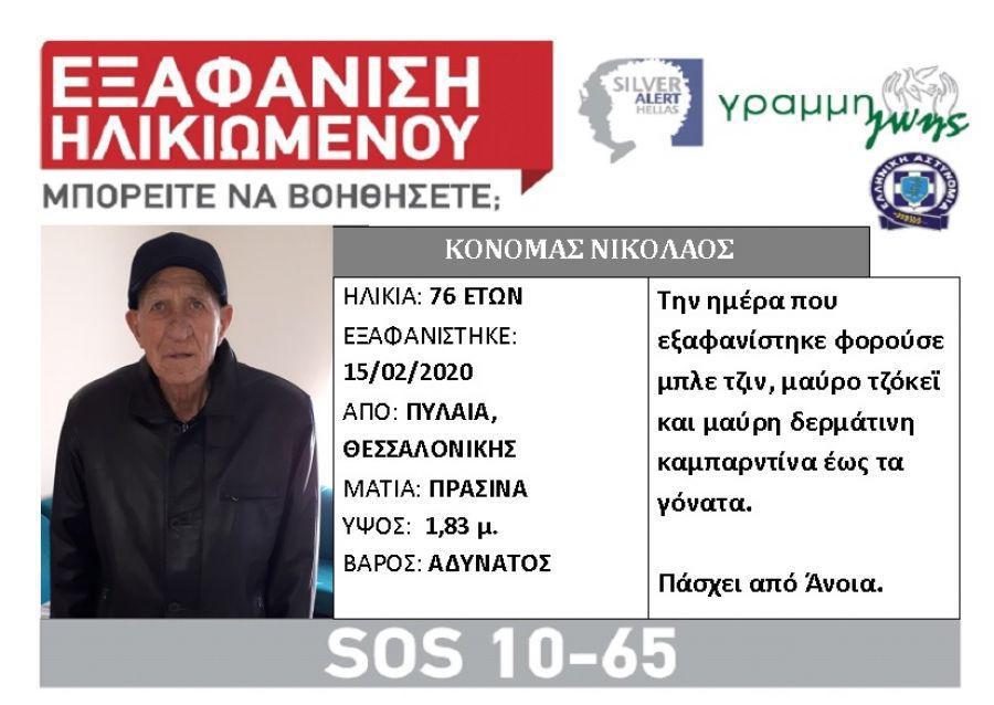 Αίσιο τέλος είχε η περιπέτεια του Νικολάου Κονόμα, ο οποίος εξαφανίστηκε χθες, Σάββατο, από το σπίτι του στην περιοχή της Πυλαίας.