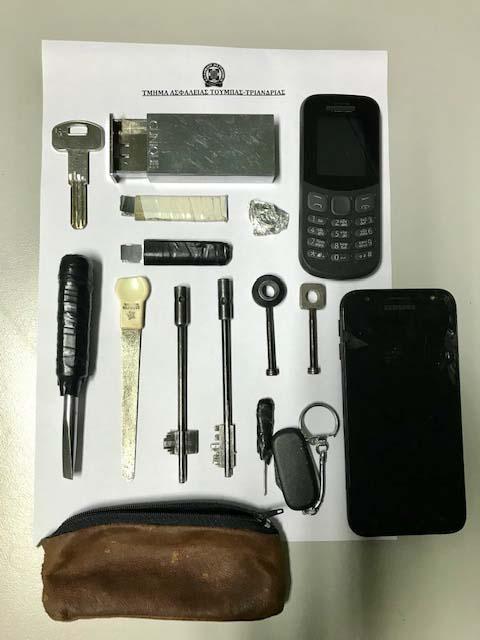 Πρόκειται για 47χρονο αλλοδαπό, στην κατοχή του οποίου βρέθηκαν και κατασχέθηκαν: Κατσαβίδι Λάμα Κλειδί Μεταλλικά ομοιώματα κλειδιών Διαρρηκτικά εργαλεία Πολυεργαλείο μικρών διαστάσεων (2) αυτοσχέδιες συσκευασίες που περιείχαν φύλλα αλουμινίου Αλουμινόχαρτο και (2) κινητά τηλέφωνα.