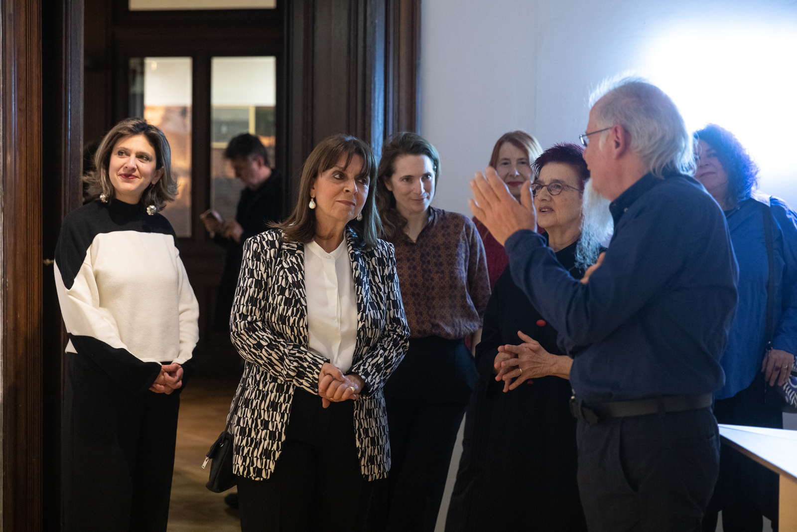 Την κ. Σακελλαροπούλου υποδέχτηκαν στο ΜΙΕΤ η κ. Έλια Βλάχου, Υποδιευθύντρια του ΜΙΕΤ, ο κ. Επαμεινώνδας Χριστοφιλόπουλος, Πρόεδρος ΔΣ του MOMus, η κ. Μαρία Τσαντσάνογλου, αναπληρώτρια Γενική Διευθύντρια MOMus και Διευθύντρια του MOMus-Μουσείου Μοντέρνας Τέχνης, η κ. Θούλη Μισιρλόγλου, διευθύντρια MOMus-Μουσείου Σύγχρονης Τέχνης και της Μπιενάλε Θεσσαλονίκης, ο κ. Γιάννης Κεσσόπουλος, μέλος ΔΣ του MOMus, ενώ στην έκθεση ξεναγήθηκε από την ίδια την επιμελήτριά της κ. Μαρία Θάλεια Καρρά. Παρόντες στην επίσκεψη ήταν και οι εικαστικοί Θανάσης Χονδρός και Αλεξάνδρα Κατσιάνη.