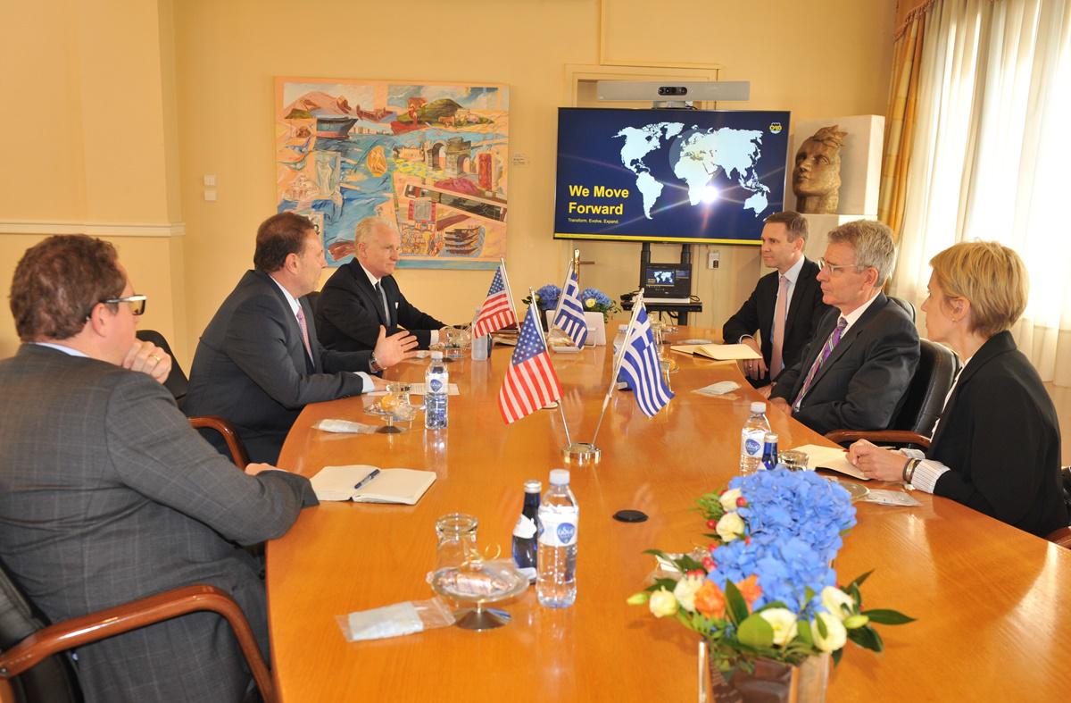 Κατά τη διάρκεια της συνάντησης με τα μέλη της Διοίκησης της ΟΛΘ Α.Ε., ο Αμερικανός Πρέσβης, ενημερώθηκε για το επενδυτικό πλάνο και τα μεγάλα αναπτυξιακά έργα που βρίσκονται σε εξέλιξη στο Λιμάνι της Θεσσαλονίκης.