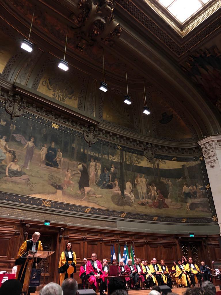 Τον έπαινο της τιμώμενης εκφώνησε ο Καθηγητής Λογοτεχνίας και Ελληνικού Πολιτισμού του Πανεπιστημίου της Σορβόννης Dominique Mulliez, ενώ προηγήθηκε διάλεξη της τιμώμενης με θέμα “Μετρό Θεσσαλονίκης: Ανα-μετρώ-ντας την ιστορία της πόλης” στο κατάμεστο από Καθηγητές Πανεπιστημίου, αρχαιολόγους, ιστορικούς, φοιτητές και κοινό, Αμφιθέατρο Guizot του ίδιου Πανεπιστημίου.
