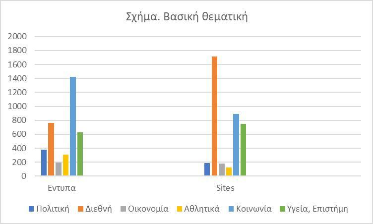 Σε ό,τι αφορά στη βασική θεματολογία στα διαδικτυακά μέσα πρώτη έρχεται η κατηγορία «διεθνή» και μετά η κατηγορία «κοινωνία», ενώ στα έντυπα συμβαίνει το αντίστροφο. Στη θεματική «κοινωνία» συμπεριλαμβάνονται θέματα που έχουν να κάνουν με τη συμμόρφωση των πολιτών στα μέτρα προφύλαξης από τον κορονοϊό, τα μέτρα που επρόκειτο να ισχύσουν την περίοδο του Πάσχα κ.ο.κ. Στην τρίτη θέση στην κατηγορία θεματική έρχεται η ενότητα «υγεία και επιστήμη», στην οποία, ως επί το πλείστον, φιλοξενούνται οι τελευταίες εξελίξεις από τον επιστημονικό τομέα στα θέματα των τεστ αντισωμάτων, των κλινικών δοκιμών των εμβολίων κλπ.
