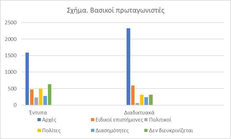 Στη δεύτερη θέση των πρωταγωνιστών της δημοσιογραφικής κάλυψης στα διαδικτυακά μέσα έρχονται οι ειδικοί επιστήμονες, οι οποίοι, ωστόσο, βρίσκονται στην τέταρτη θέση στα έντυπα μέσα, αφού στη δεύτερη θέση έρχονται τα δημοσιεύματα που δεν έχουν συγκεκριμένη αναφορά σε δρώντες. Στην προτελευταία θέση τόσο στα έντυπα, όσο και στα ηλεκτρονικά μέσα βρέθηκαν οι διασημότητες. Στην τελευταία θέση τόσο στα έντυπα, όσο και στα ηλεκτρονικά μέσα έρχονται οι πολιτικοί είτε ως μεμονωμένα πρόσωπα, είτε μέσω των κομμάτων τους.
