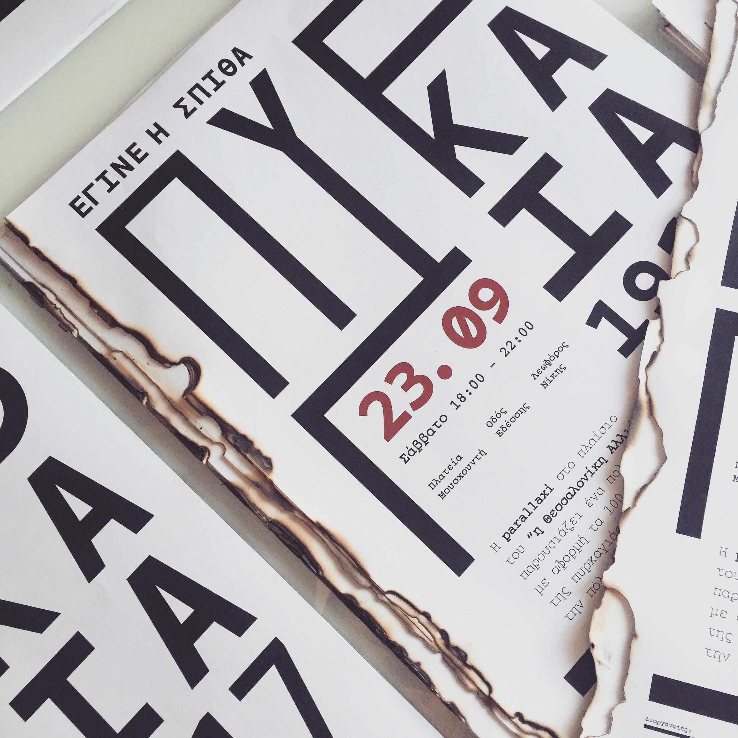 Η οπτική επικοινωνία της δράσης Έγινε η Σπίθα Πυρκαγιά του Θεσσαλονίκη Αλλιώς της Parallaxi σχεδιάστηκε, όπως και όλες οι προηγούμενες από την ομάδα των Dolphins Communication Design.