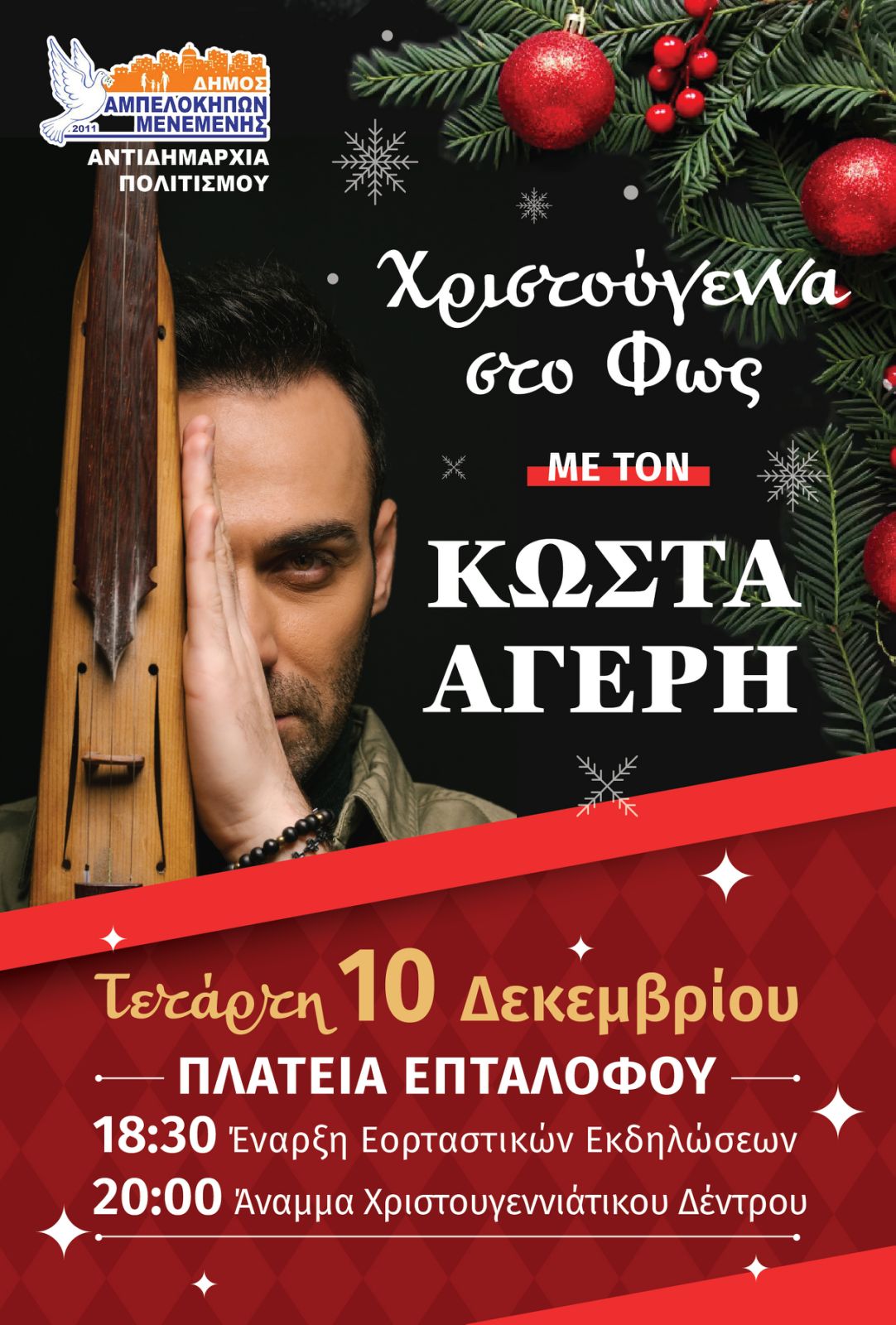 • Στις 20.00. Το άναμμα του Χριστουγεννιάτικου Δέντρου από το Δήμαρχο κ. Λάζαρο Κυρίζογλου θα φωτίσει την πόλη, ενώ ακολουθεί μεγάλη συναυλία με τον ερμηνευτή κ. Κώστα Αγέρη.