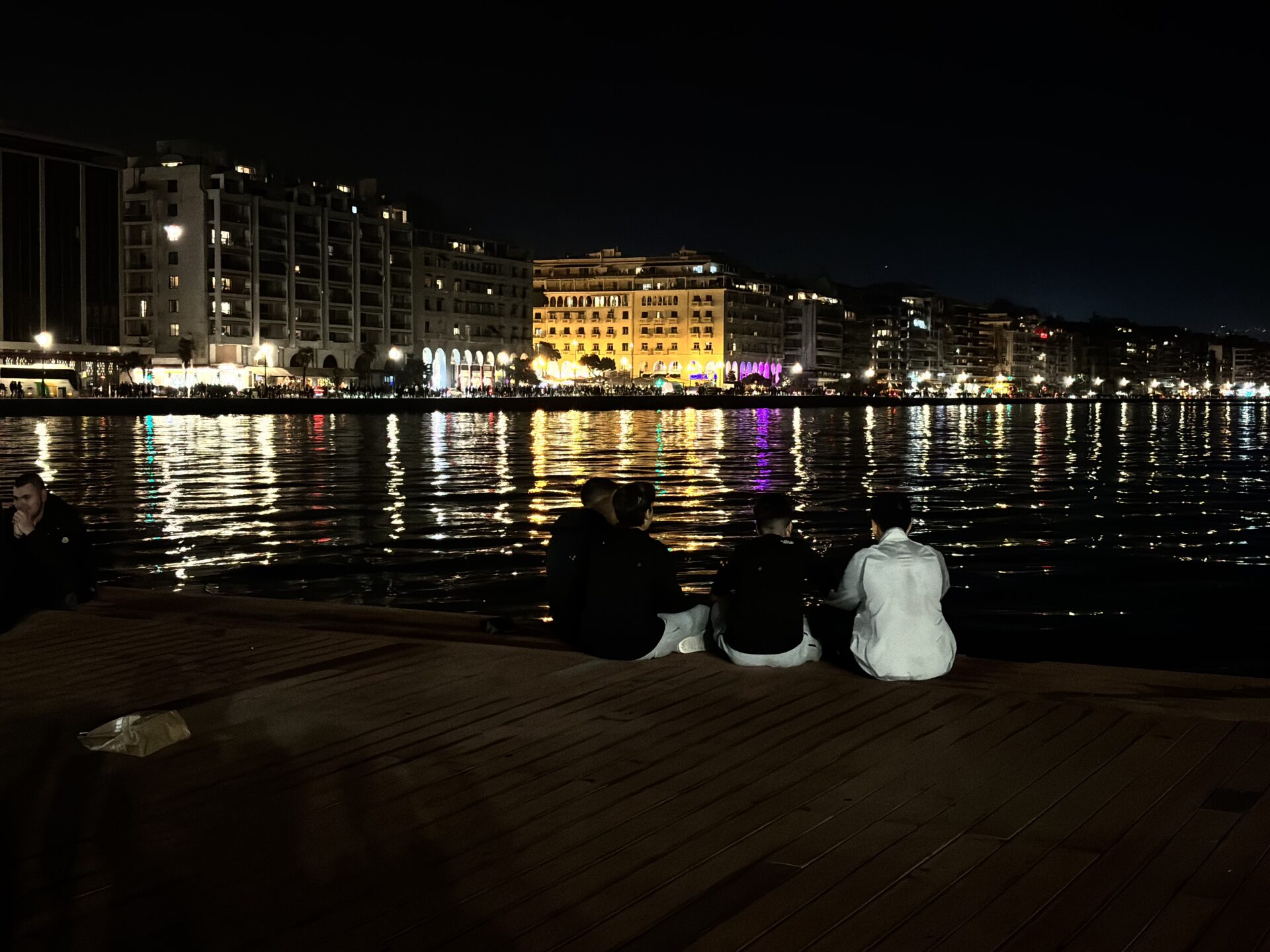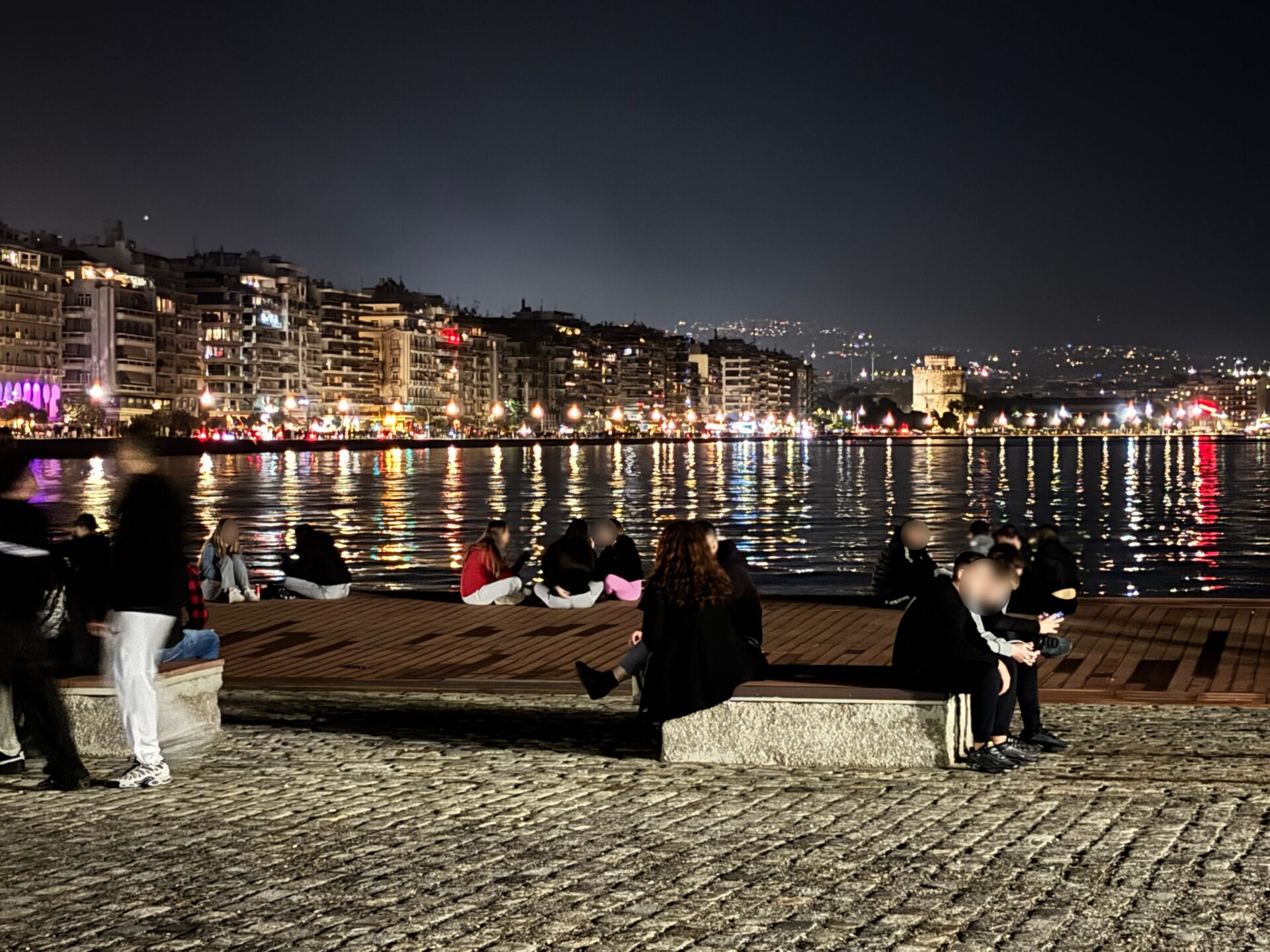Στο λιμάνι η ατμόσφαιρα έχει έναν πιο ήρεμο ρυθμό. Ζευγαράκια εφήβων περπατούν χέρι-χέρι, ανταλλάσσουν τα πρώτα τους φιλιά, λένε τα πρώτα γλυκόλογα. Άλλες παρέες κάθονται στο ξύλινο ντεκ, παίζοντας χαρτιά ή άλλα παιχνίδια σε έναν κύκλο που τους κρατάει ενωμένους, ενώ άλλοι χαζεύουν από τα παγκάκια την αντανάκλαση από τα κίτρινα φώτα της πόλης, στα νερά του Θερμαϊκού.