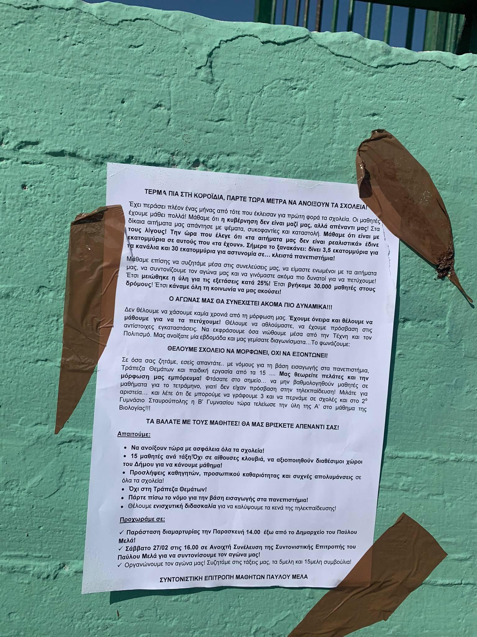 «37 μαθητές του 7ου Δημοτικό Σχολείου Σταυρούπολης του Δήμου Παύλου Μελά υποχρεώθηκαν από τις 21/02/2021 να μείνουν εκτός εκπαιδευτικής διαδικασίας καθώς είναι κάτοικοι Εύοσμου και διαμένουν στα όρια των Δήμων Εύοσμου –Κορδελιού και Παύλου Μελά.