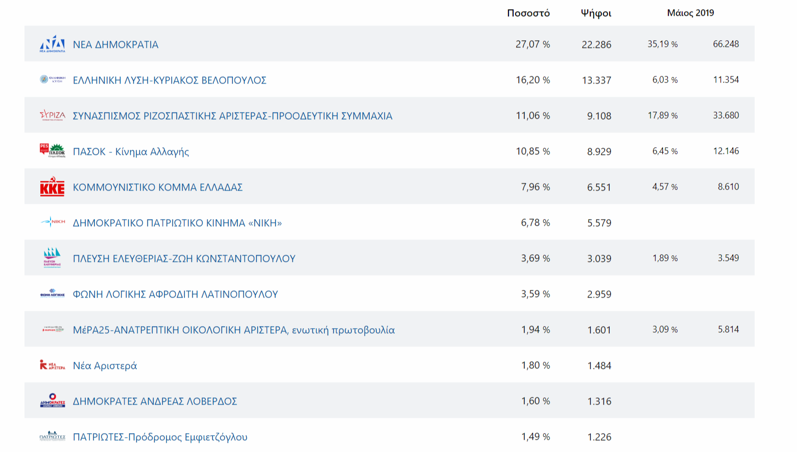 Πιο συγκεκριμένα, σύμφωνα με τα έως τώρα αποτελέσματα στην κορυφή των ψήφων βρίσκεται η ΝΕΑ ΔΗΜΟΚΡΑΤΙΑ με ποσοστό 27,07% και ακολουθεί η ΕΛΛΗΝΙΚΗ ΛΥΣΗ με 16,20%.