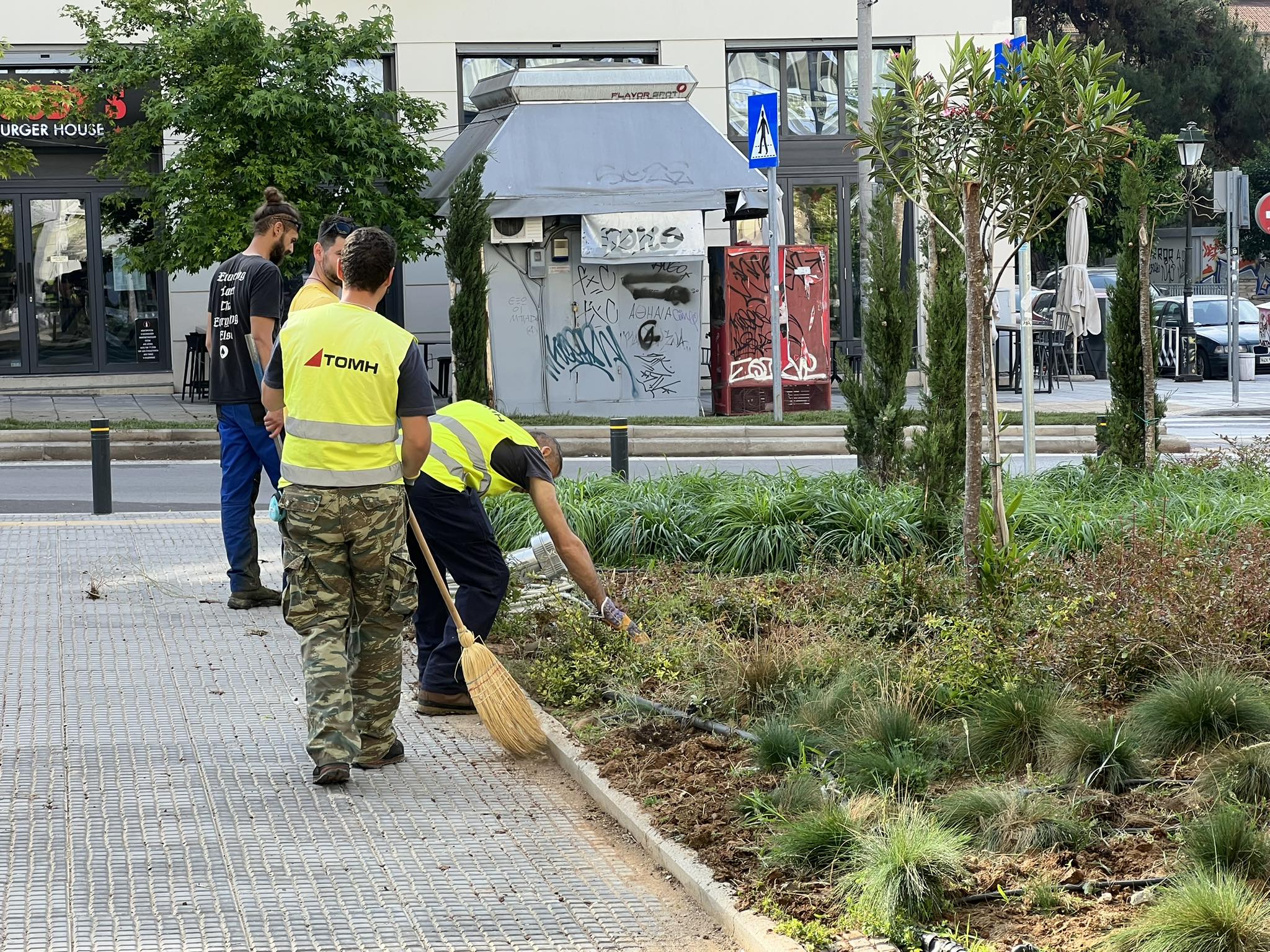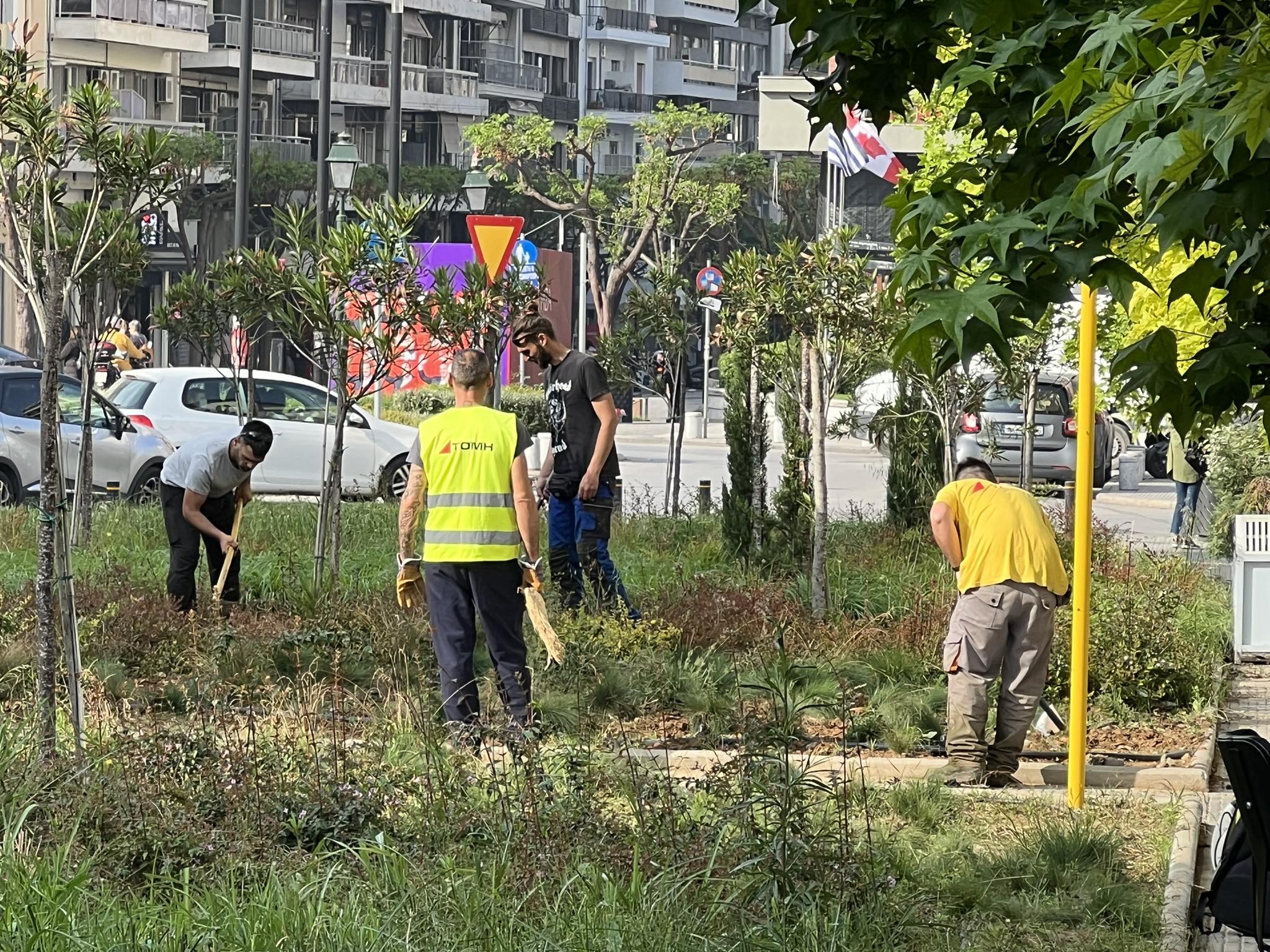 Και λίγο πιο κάτω, στην κάτω έξοδο του σταθμού επίμονοι κηπουροί κουρεύουν χόρτα, φυτεύουν δέντρα, στρώνουν χορτάρι, το ποτίζουν.