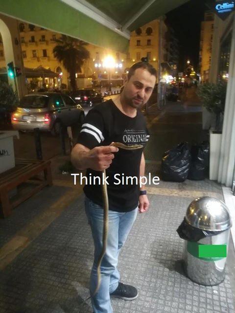 Ο άνθρωπος που έσπευσε και έπιασε το φίδι χθες βράδυ, ο κ. Μιχάλης, περνούσε τυχαία από το σημείο όταν άκουσε τις φωνές από υπάλληλο ότι υπάρχει φίδι μπροστά από την είσοδο του καταστήματος.