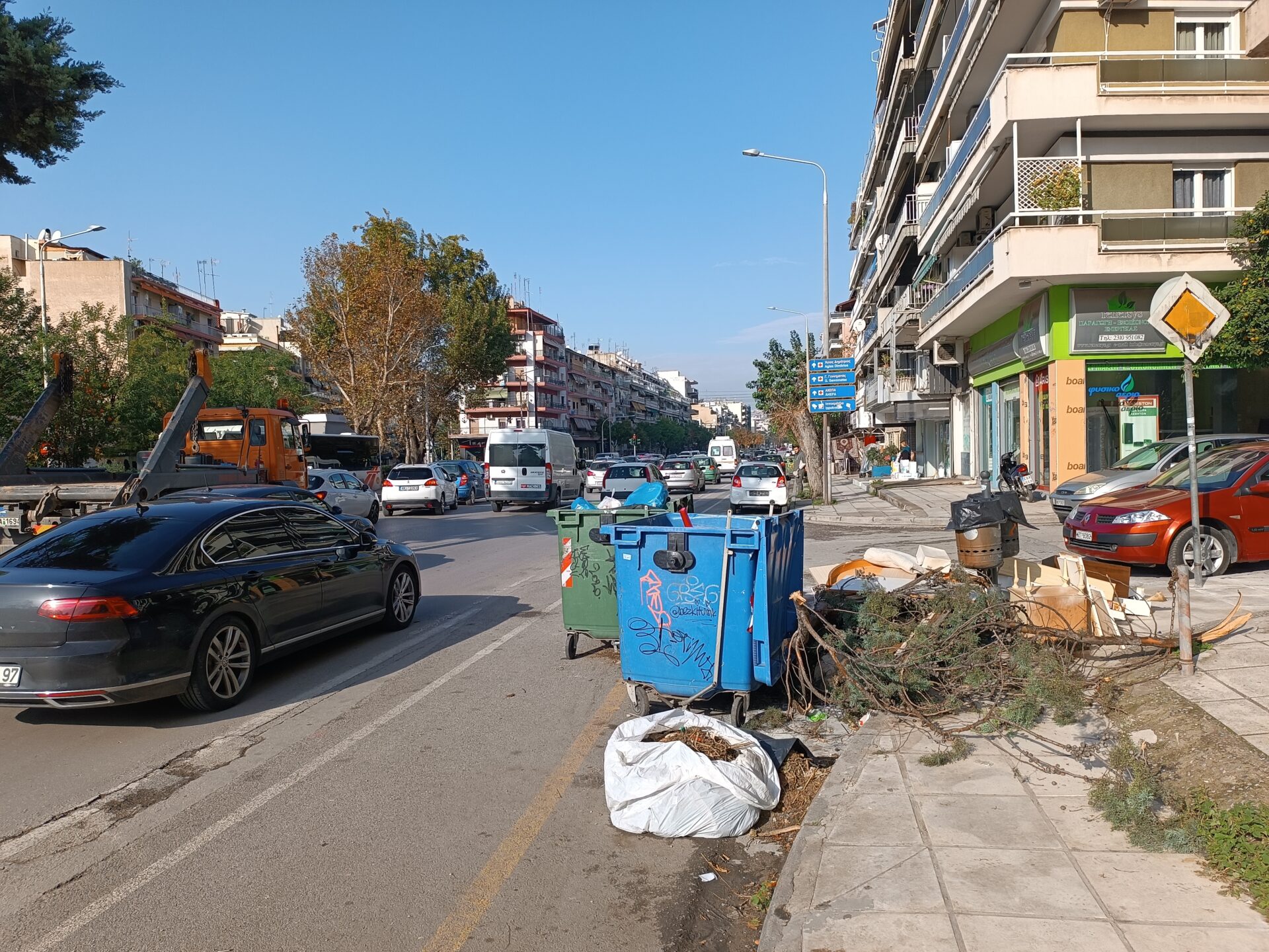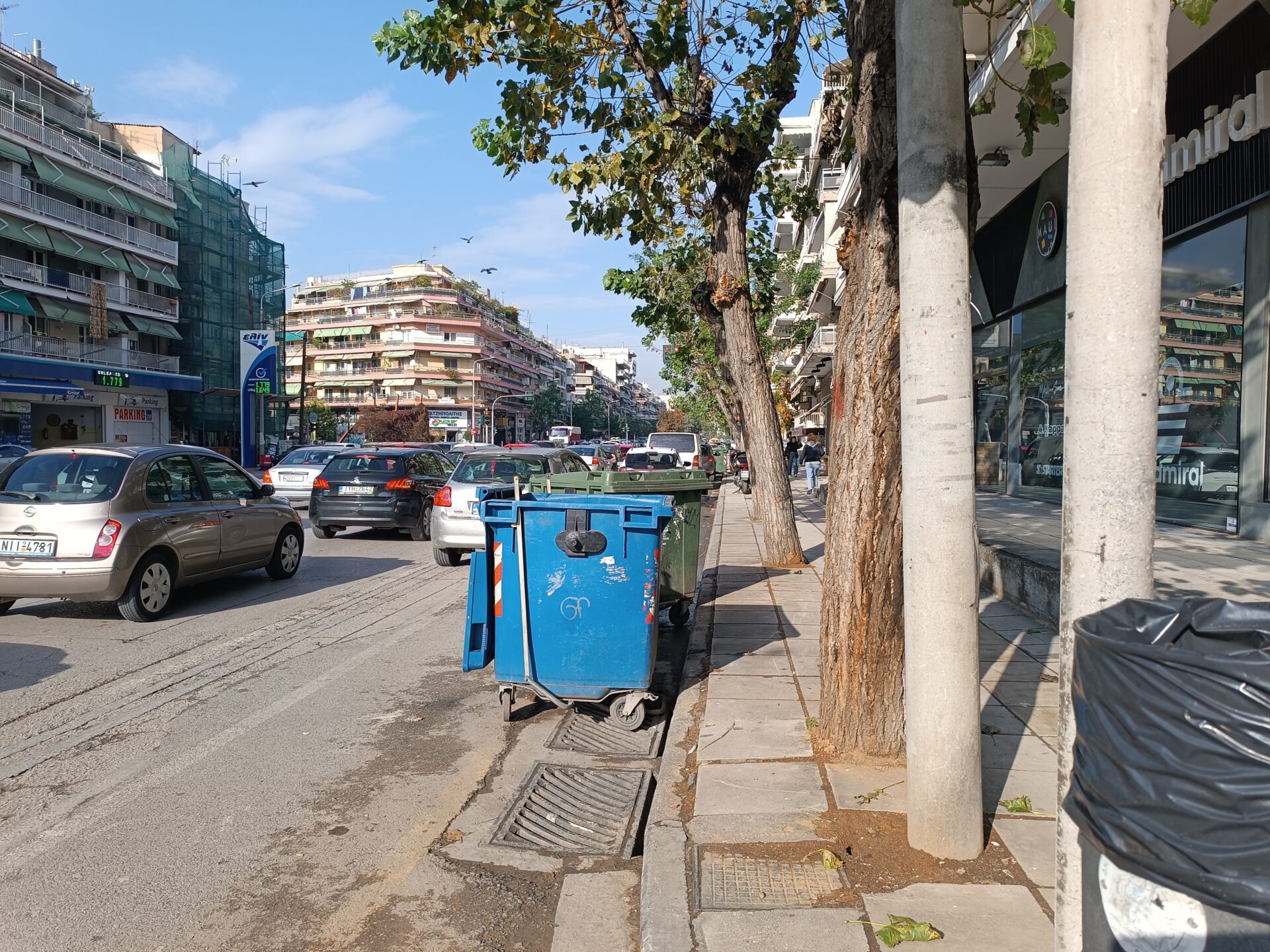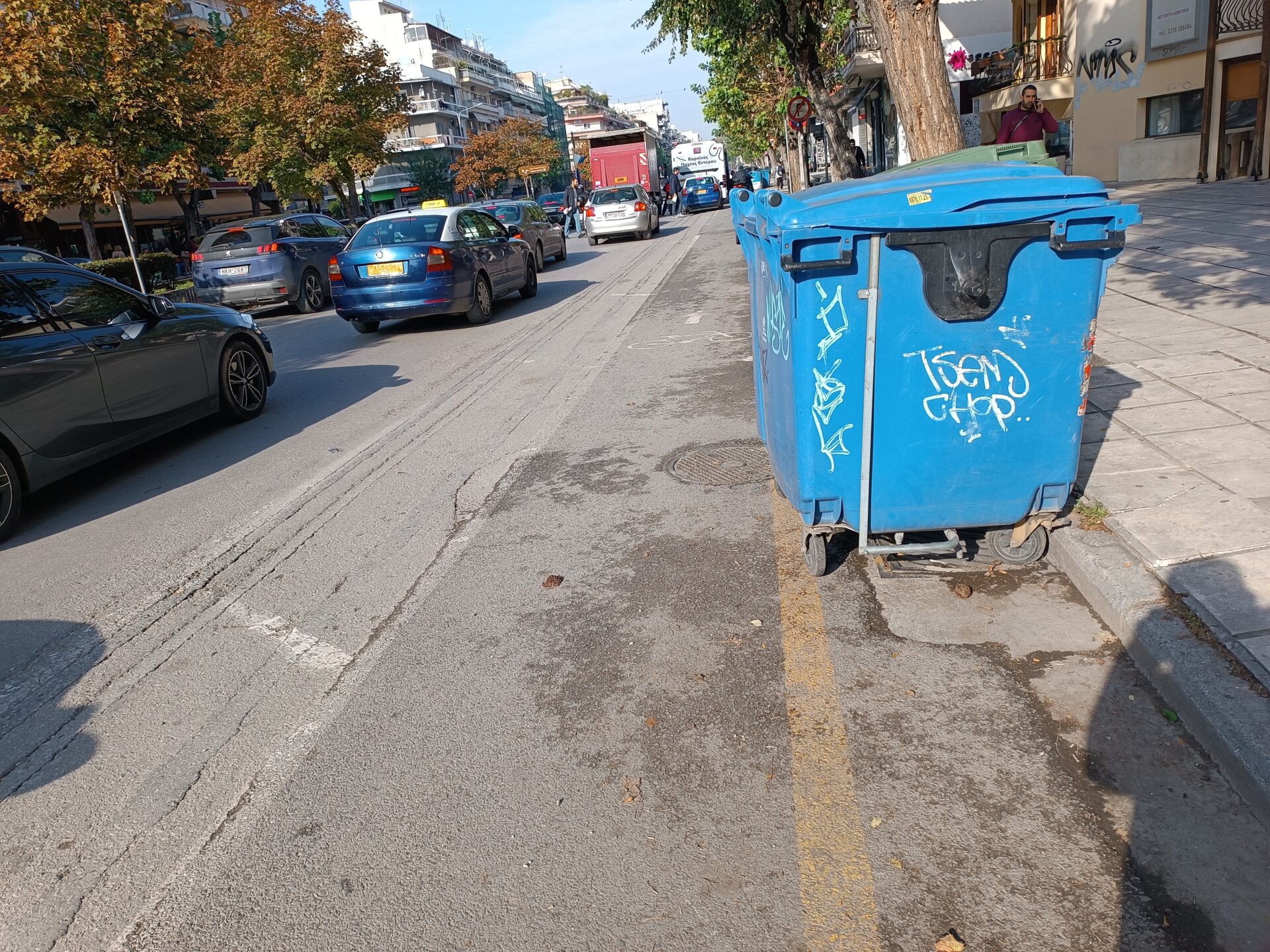 Πράγματι, κατά μήκος της οδού και ενώ η απομάκρυνση των αυτοκινήτων έχει αλλάξει την όψη και εικόνα του δρόμου, η μεγάλη παραφωνία είναι αυτή των κάδων απορριμμάτων και ανακύκλωσης που εξέχουν και παραμένουν «παρκαρισμένοι» σε πολλά σημεία της Κ. Καραμανλή, διότι δεν υπάρχουν οι απαραίτητες εσοχές.