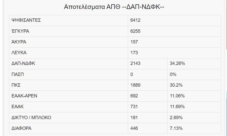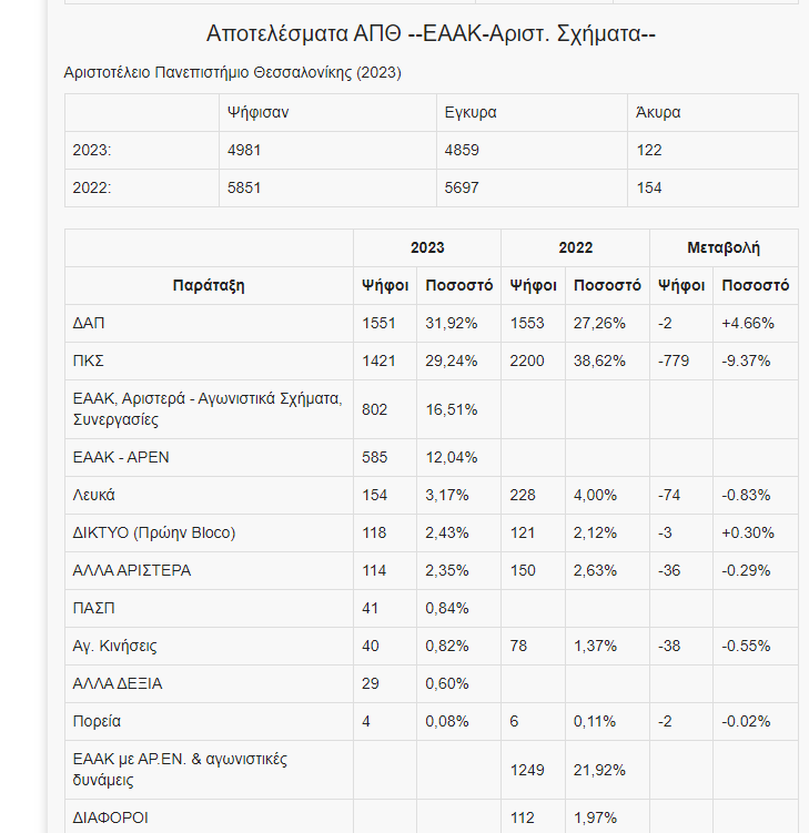 Όσον αφορά το ΑΠΘ και σύμφωνα με τα όσα μεταδίδει η ιστοσελίδα foititikanea.gr, οι παρατάξεις δίνουν τα εξής αποτελέσματα.