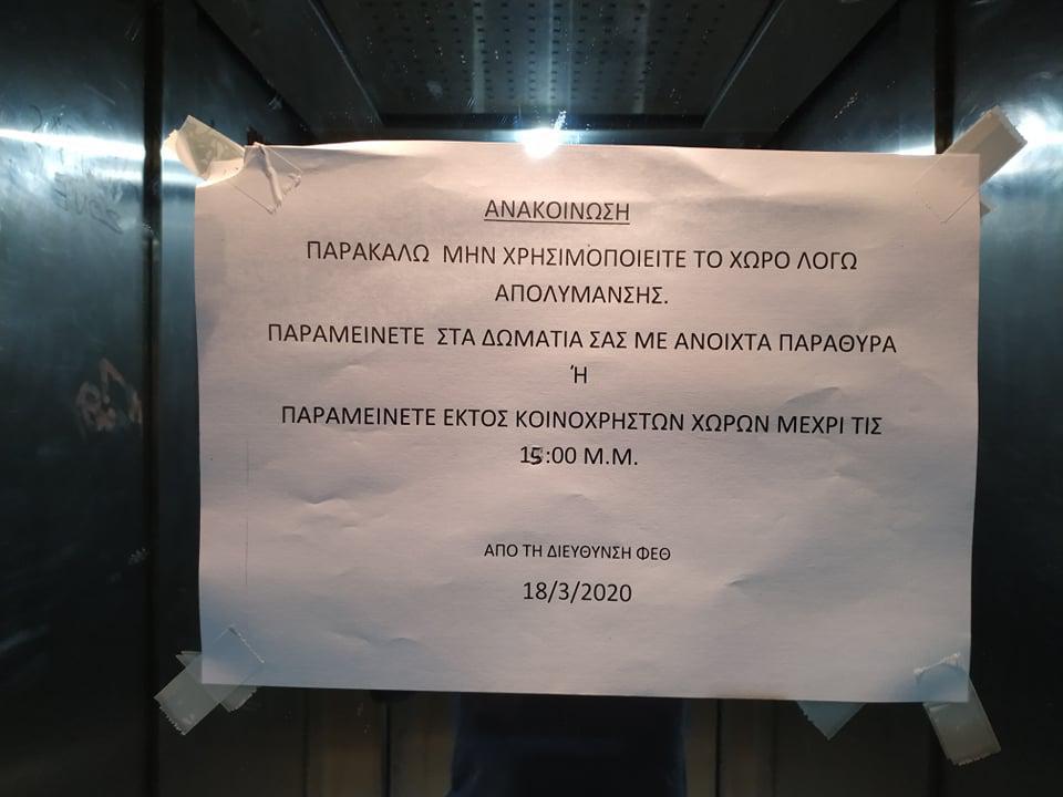 Ανακοίνωση πλησίον των ασανσέρ ενημέρωνε πριν από λίγες ημέρες τους φοιτητές για απολύμανση χώρων, τη Δευτέρα, στις 16 Μαρτίου. Τελικώς, το συνεργείο για την απολύμανση των κοινόχρηστων χώρων φάνηκε την Τετάρτη, στις 18 Μαρτίου, δηλαδή με καθυστέρηση δύο ημερών. Θα ήταν, βεβαίως, περίεργο και συνάμα πρωτόγνωρο μία εργασία σε αυτήν τη χώρα να τελείται έγκαιρα και χωρίς καμία καθυστέρηση.