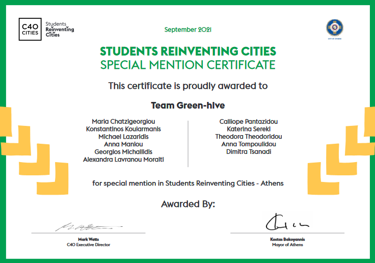 Η διεπιστημονική φοιτητική ομάδα “GreenHive” την οποία συγκρότησαν 11 φοιτητές και φοιτήτριες, προπτυχιακού και μεταπτυχιακού επιπέδου των Τμημάτων Μηχανικών Χωροταξίας και Ανάπτυξης (ΤΜΧΑ), Γεωπονίας, και Αρχιτεκτόνων Μηχανικών, διακρίθηκε στο διαγωνισμό, λαμβάνοντας τη μοναδική Ειδική Μνεία (Special Mention).