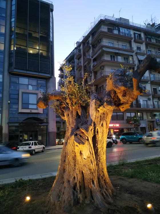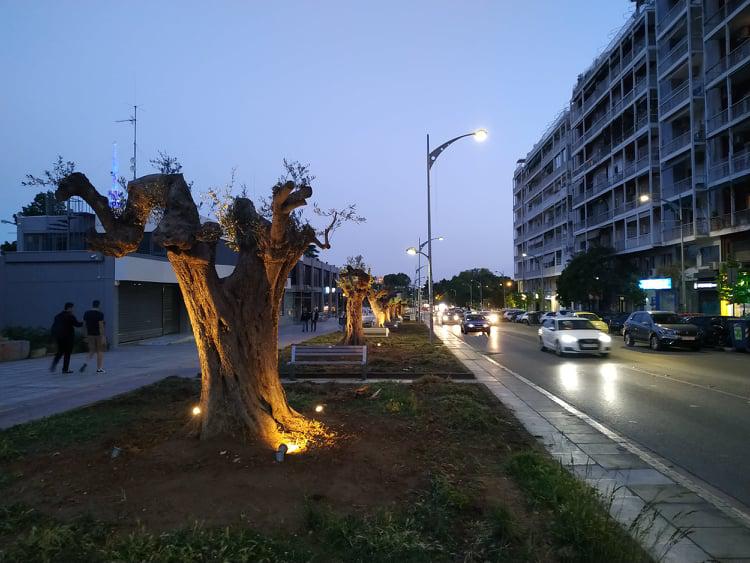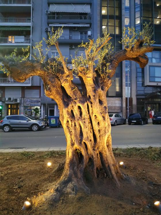 Φωτίστηκαν οι αιωνόβιες ελιές της οδού Αγγελάκη, δημιουργώντας μια ενδιαφέρουσα εικόνα που θυμίζει παράξενα γλυπτά.