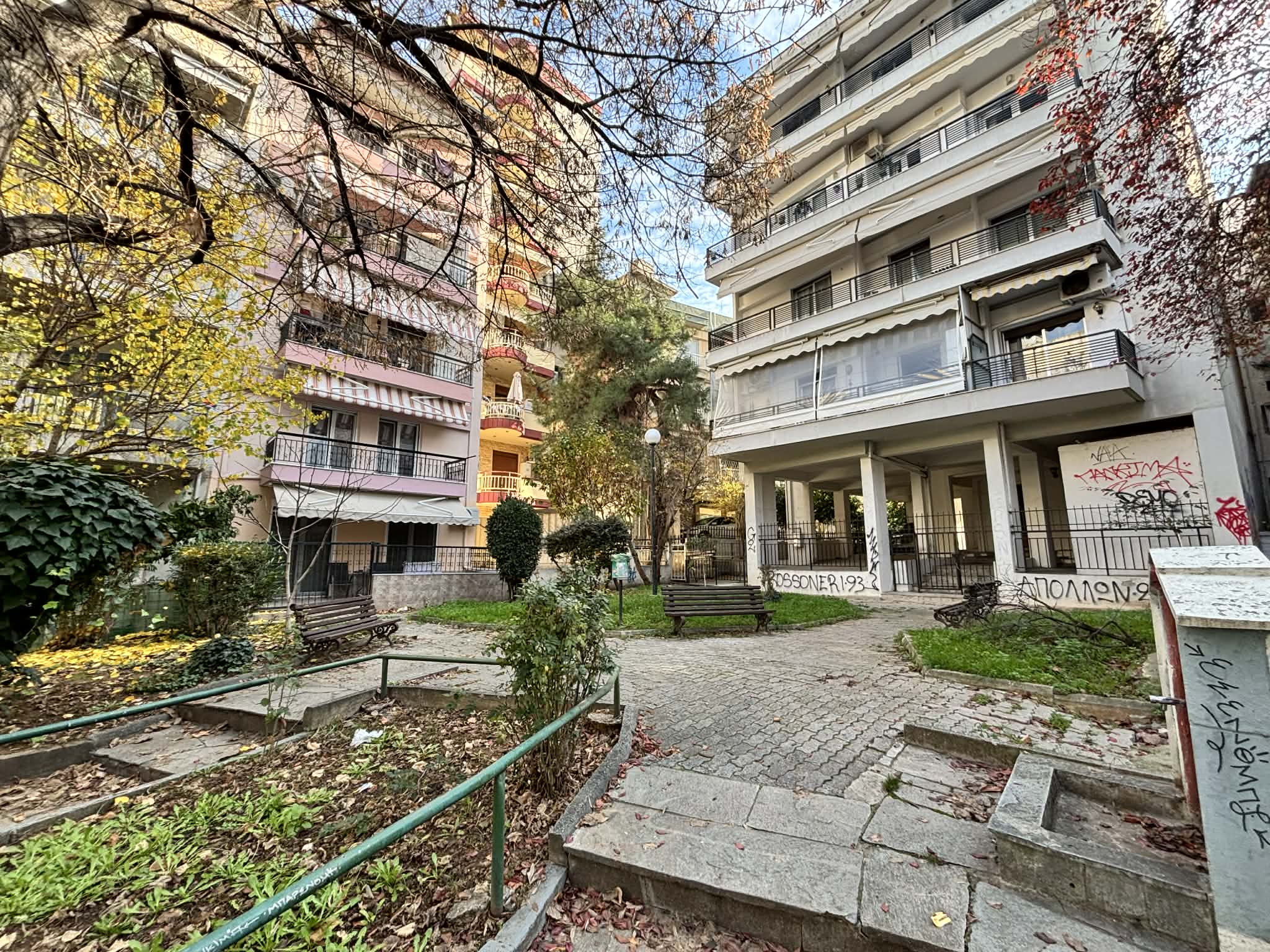 Οι ογκώδεις πολυκατοικίες υψώνονται η μία δίπλα στην άλλη, καλύπτοντας το μεγαλύτερο μέρος της εικόνας μας και αφήνοντας περιορισμένους δημόσιους χώρους για τους κατοίκους.