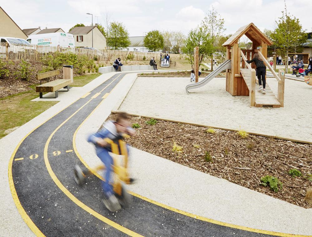 Αυτή λοιπόν η περιμετρική διαδρομή είναι που ενσωματώνει ένα πλήθος επιλογών. Παγκάκια, γκαζόν, χώρος για πικ νικ, μια βρύση ακόμα και ένα υπόστεγο για μικρά τρίκυκλα. Οι εγκαταστάσεις για την παιδική χαρά βρίσκονται μέσα στον χώρο που δημιουργεί αυτός ο “ευέλικτος” στη χρήση του ποδηλατόδρομος και είναι έτσι σαφέστατα οριοθετημένος προσδίδοντας μια αίσθηση ασφάλειας και προστασίας.