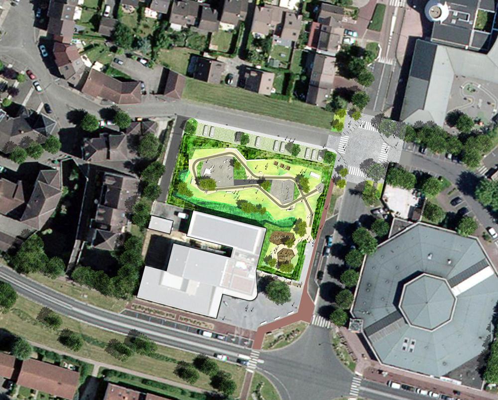 Το πάρκο και η παιδική χαρά του συγκεκριμένου project είναι συνδεδεμένα, χάρη σε ένα μαυροπίνακα εδάφους, μια επιφάνεια ασφάλτου που λειτουργεί ως έκφραση γραφής σε ελεύθερο χώρο.