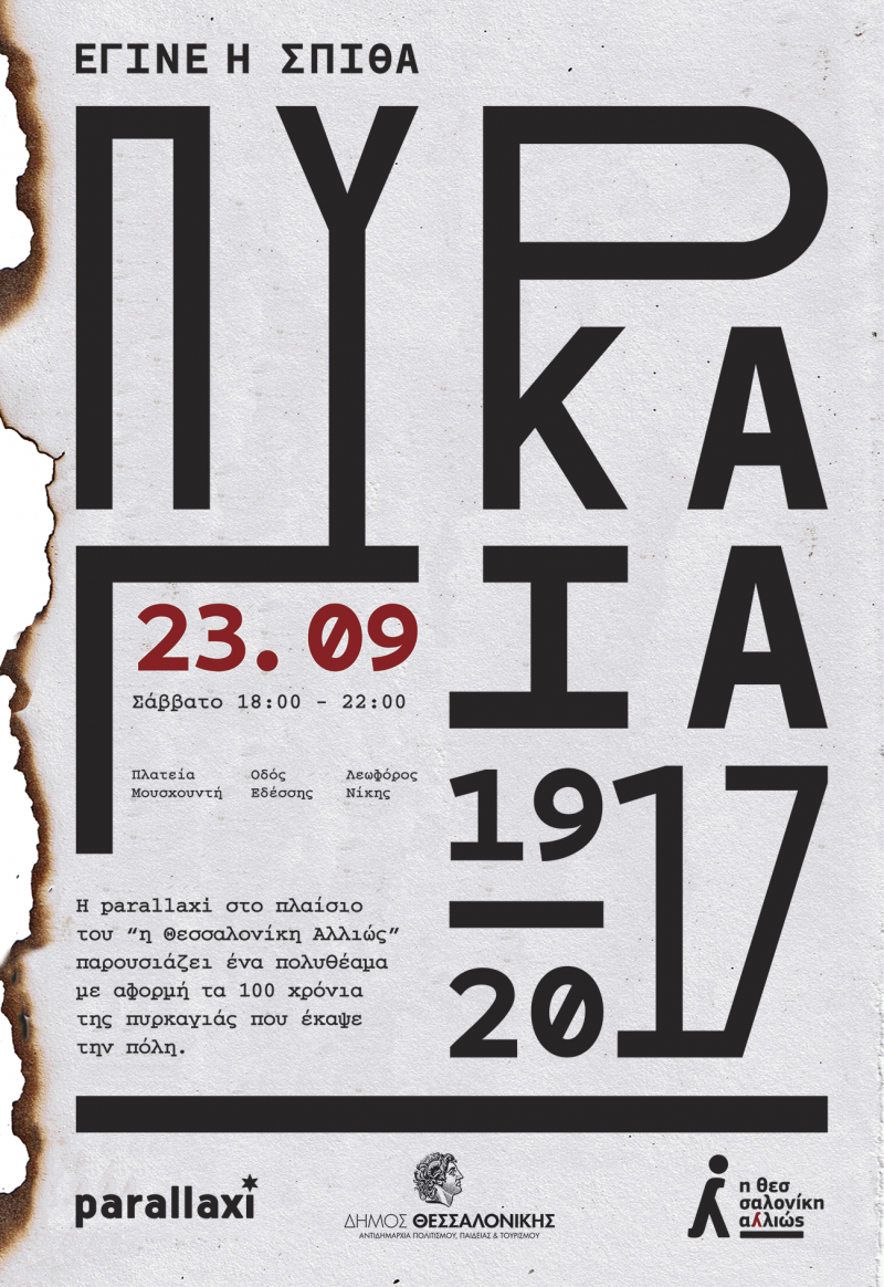 Έφτασε η στιγμή να ζητήσουμε τη συνδρομή σας και πάλι! To Σάββατο 23 Σεπτεμβρίου η πόλη θα ζήσει μια ιστορική στιγμή, ένα πολυθέαμα που θα ζωντανέψει μια από τις πιο σημαντικές στιγμές της νεώτερης ιστορίας της πόλης: Της Πυρκαγιάς του 1917, από την οποία συμπληρώνονται φέτος 100 χρόνια. Μάθε τα πάντα για αυτό το μεγάλο εγχείρημα εδώ και λάβε μέρος σαν εθελοντής εκείνη την ημέρα σε μια δράση για την οποία θα εργαστούν εκατοντάδες άνθρωποι και 40 φορείς. Στείλε το ονοματεπώνυμο και τηλέφωνο επικοινωνίας στο thessalonikiallios@gmail.