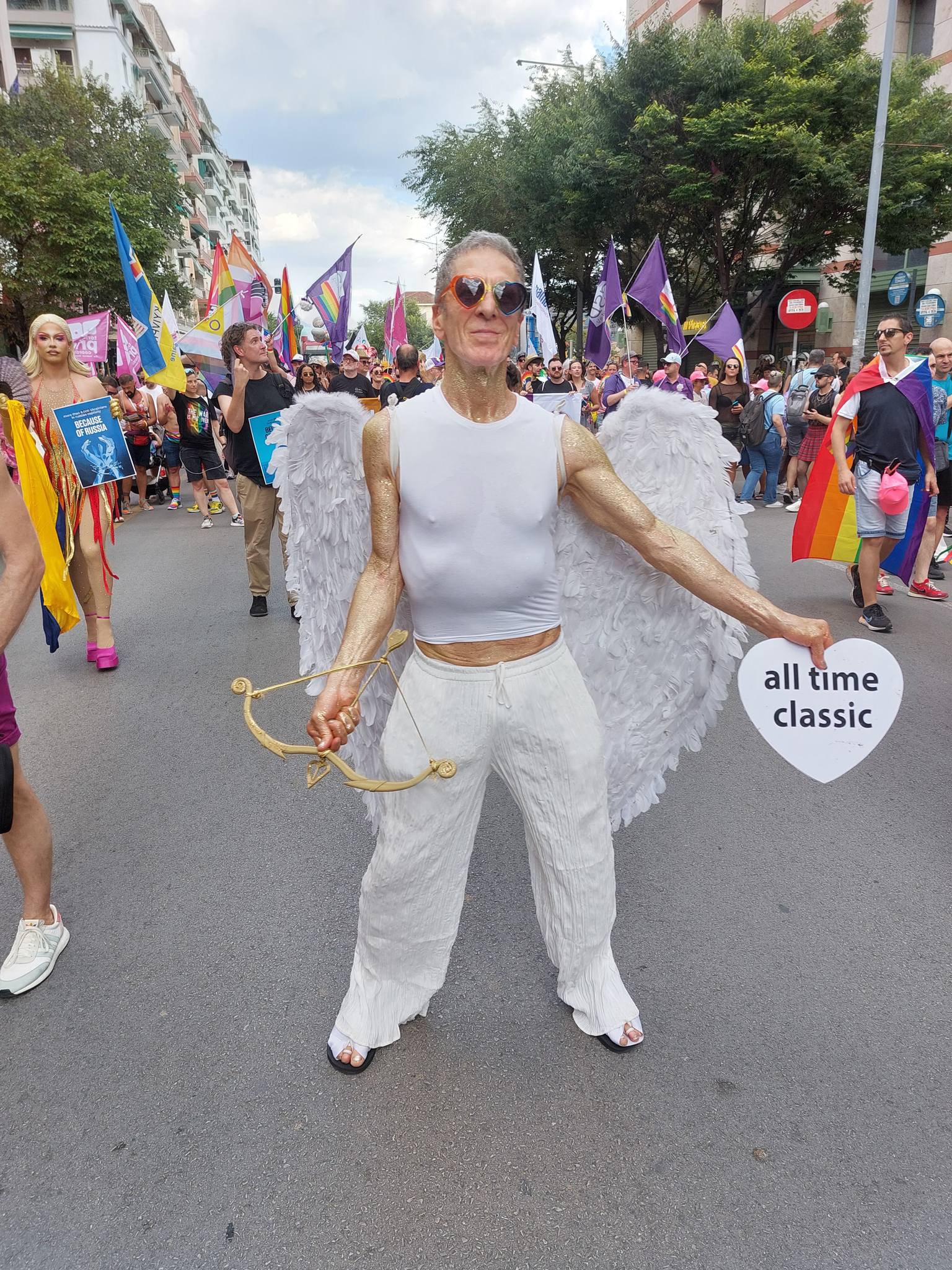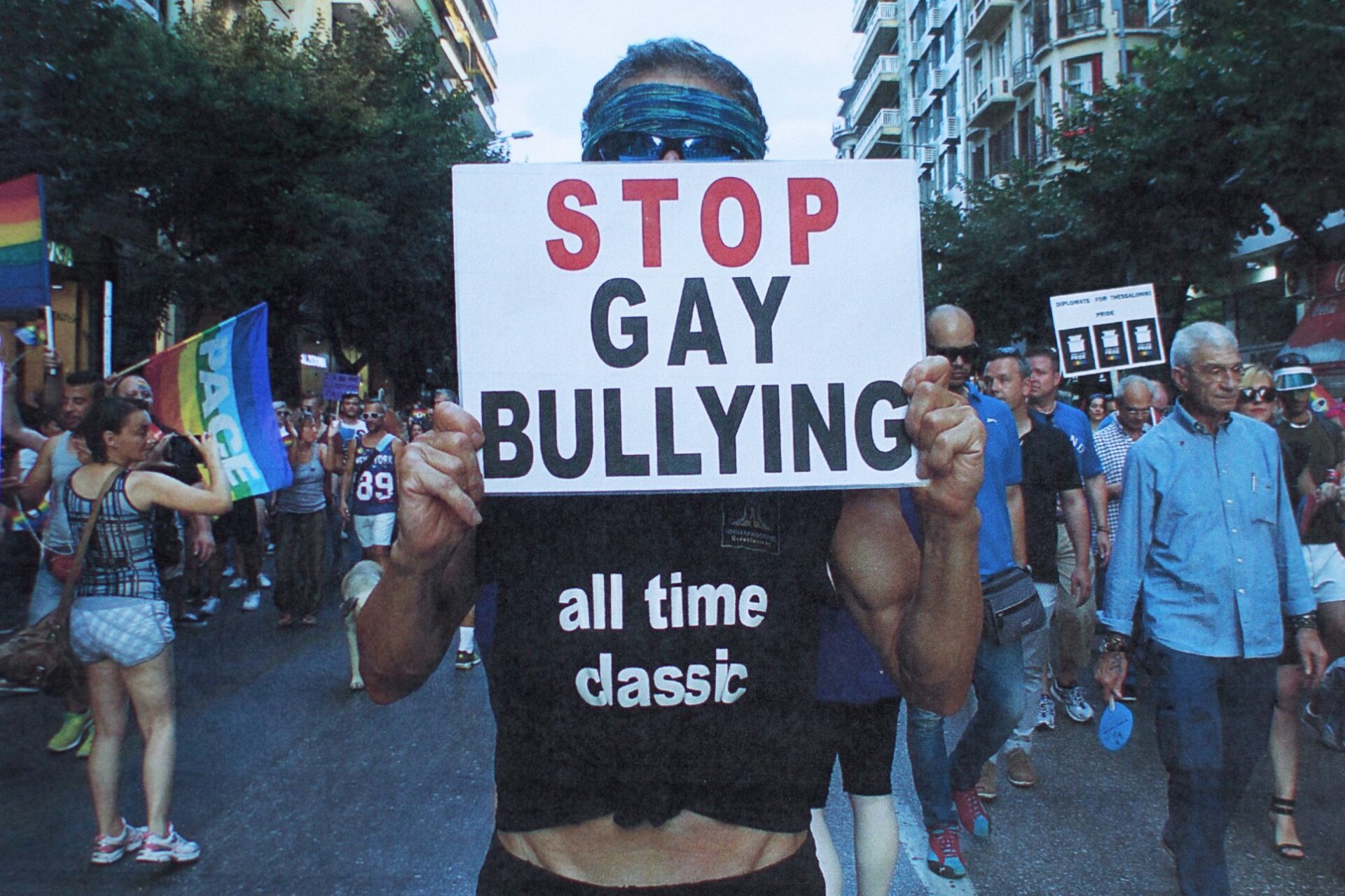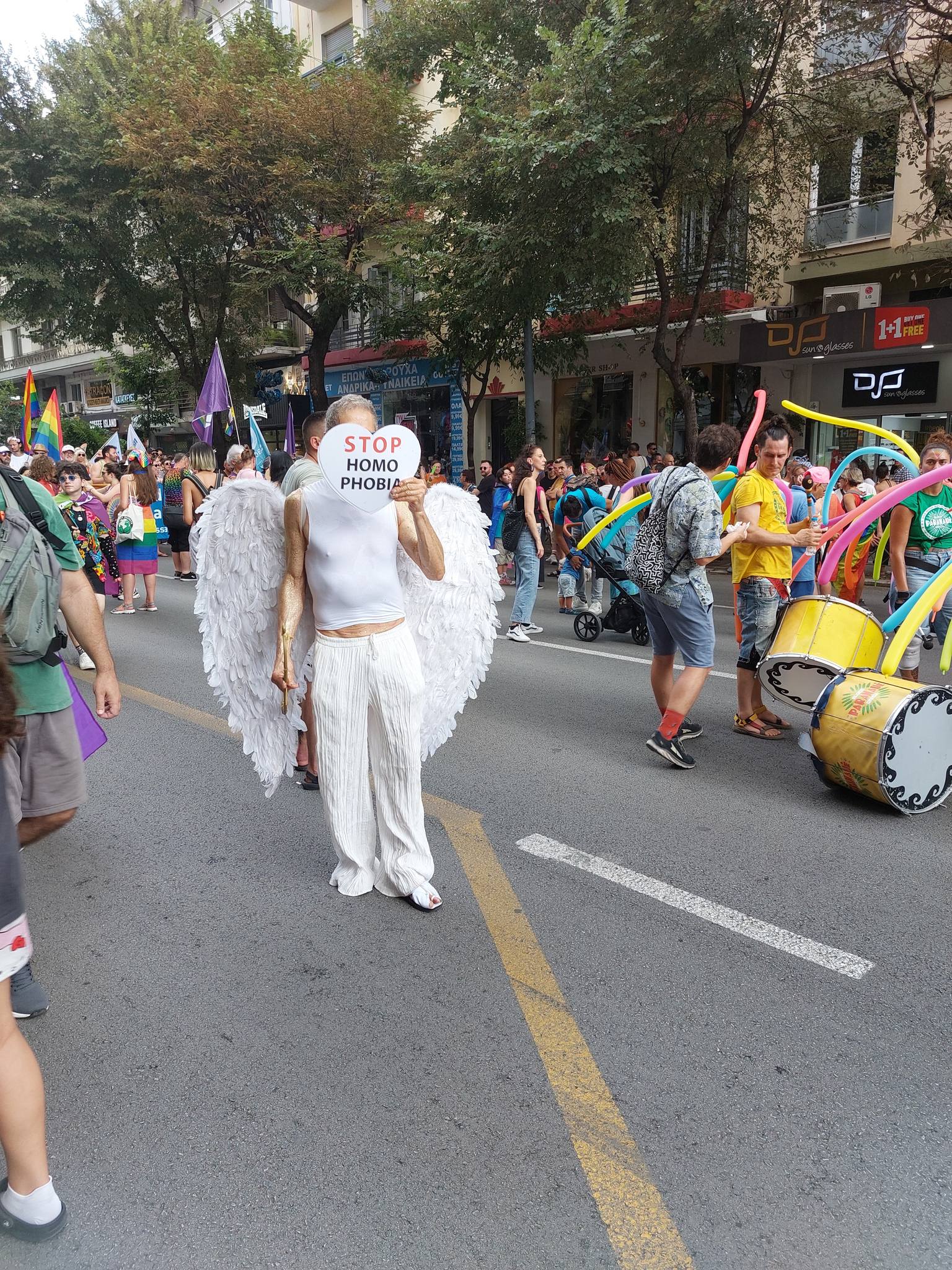 Με το συγχωρεμένο τον Μπουτάρη έχουμε μια φωτογραφία από το Pride που μου αρέσει πάρα πολύ, κρατάω ένα πλακάτ με σύνθημα Stop Bullying. Γι’ αυτό στο Euro Pride ντύθηκα έρωτας, μια θεότητα ελληνική πέρα από στερεότυπα και προκαταλήψεις. Ήταν ωραίο το Ευρωπαϊκό Pride στην Θεσσαλονίκη θα μπορούσε να είναι καλύτερο. Δεν ήταν ξεσηκωτικό και σε άμεση επαφή με τον κόσμο της πόλης. Έπρεπε να έχει dj, χορό, δρώμενα και διασκέδαση παντού, στους δρόμους, όλη την ημέρα. Θα μπορούσε να ήταν καλύτερο από πολλές απόψεις. Φέρανε τραγουδιστές show από Ελλάδα και εξωτερικό, δεν παρουσίασαν κάτι αμιγώς Ελληνικό. Θα έβαζα 5 σέξι ωραία αγόρια να χορεύουν συρτάκι να γίνει χαμός.