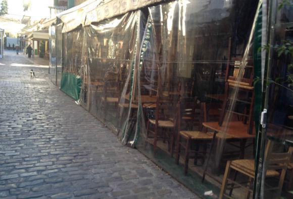 Εικόνα τρίτη: Τα νάιλον. Η παράνομη κατάληψη δημοσίων χώρων από τις ταβέρνες και τα καφέ δεν έχει πλέον όριο. Τα τραπεζοκαθίσματα που στόλιζαν τις υπαίθριες εκθέσεις επίπλων των μαγαζιών προστατεύονται πια από κατασκευές νάιλον που καταλαμβάνουν πεζοδρόμια και πεζόδρομους, ενώ πεζοί περπατούν στη μέση του δρόμου. Στο εσωτερικό τους υπάρχουν και σόμπες για το κρύο. Στις 4 Αυγούστου του 2011 ο αρμόδιος αντιδήμαρχος κ. Κουράκης είχε ανακοινώσει τη νίκη στη μάχη εναντίον του νάιλον στην Άθωνος με την απομάκρυνση όλων των αυθαίρετων κατασκευών. Μάλιστα. Έκτοτε Άθωνος έγιναν όλες οι γειτονιές της πόλης.