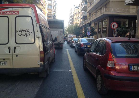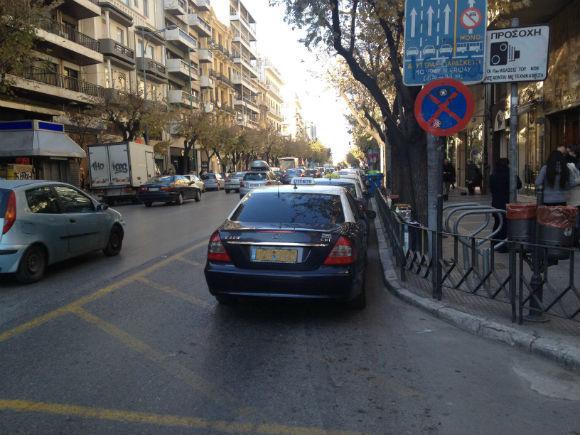 Εικόνα τέταρτη: Παράνομο παρκάρισμα. Η κατάργηση της δημοτικής αστυνομίας και η παντελής έλλειψη αστυνόμευσης από αστυνομία και τροχαία φέρνει την πόλη στα όρια της ασφυξίας. Μητροπόλεως σήμερα το πρωί. Η μια λωρίδα κατειλημμένη από φορτηγά και αυτοκίνητα που σταθμεύουν εκεί και στο λεωφορειόδρομο προσπαθούν να μετακινηθούν αστικά, αυτοκίνητα και μηχανάκια. Χάρμα.