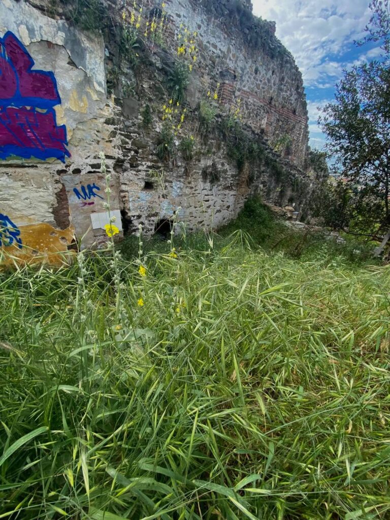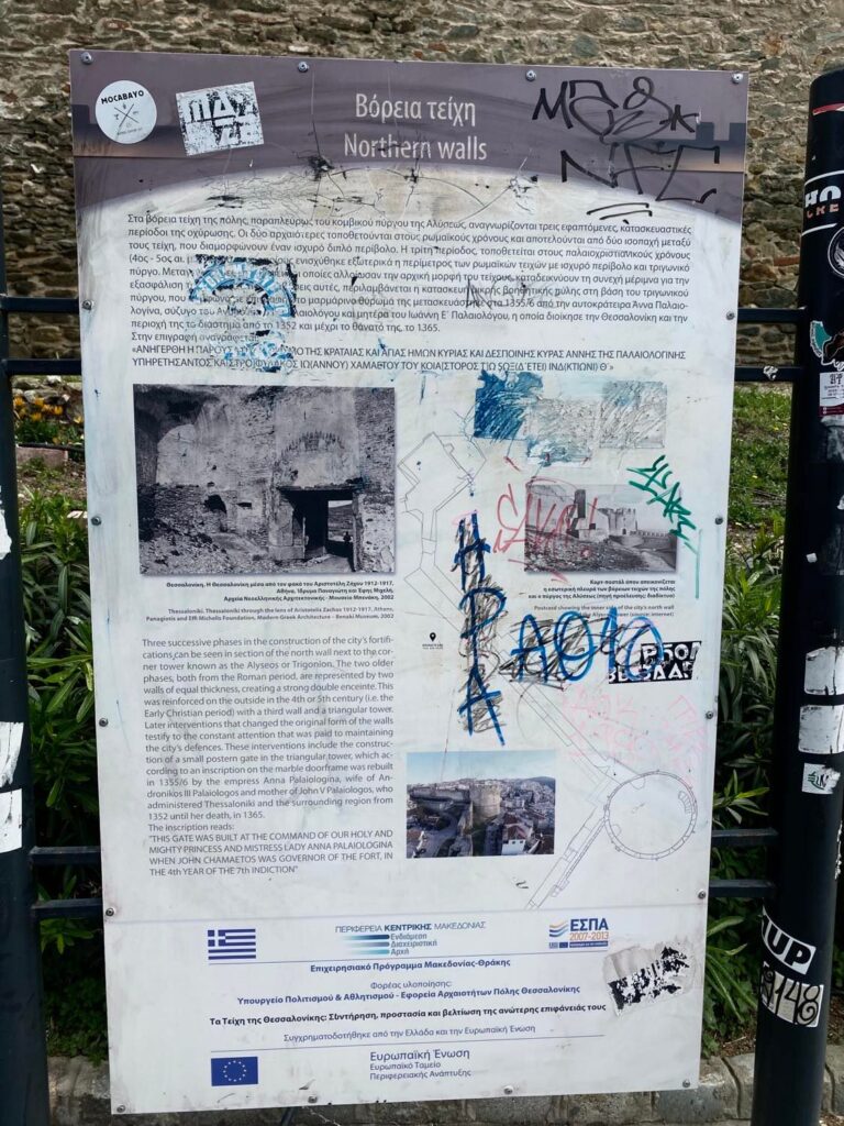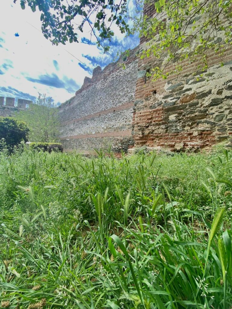 Το χορτάρι έχει να κουρευτεί κανείς δεν ξέρει από πότε, η βόλτα μοιάζει με βόλτα σε ζούγκλα, τα σκουπίδια είναι παντού, συνθήματα και μουτζούρες πάνω στο βυζαντινό τείχος.