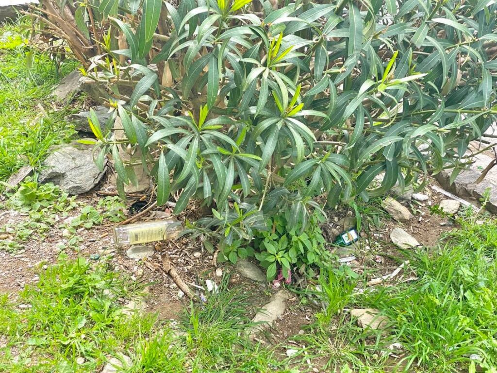 Ένας νεαρός δείχνει σε έναν άλλο μπουκάλια από ούζα και αλκοόλ, δέκα μέτρα από την είσοδο στους θάμνους και γελάνε.
