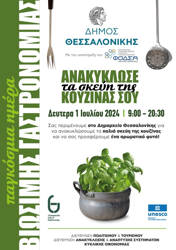Ο Δήμος Θεσσαλονίκης με το τμήμα Τουρισμού της Διεύθυνσης Πολιτισμού διοργανώνουν την «1η Γιορτή ανακύκλωσης μαγειρικών σκευών», μια φιλική προς το περιβάλλον εκδήλωση, που θα πραγματοποιηθεί στο πλαίσιο της Παγκόσμιας ημέρας βιώσιμης γαστρονομίας, την 1η Ιουλίου στο Δημαρχείο, από τις 9.00 έως τις 20.30.