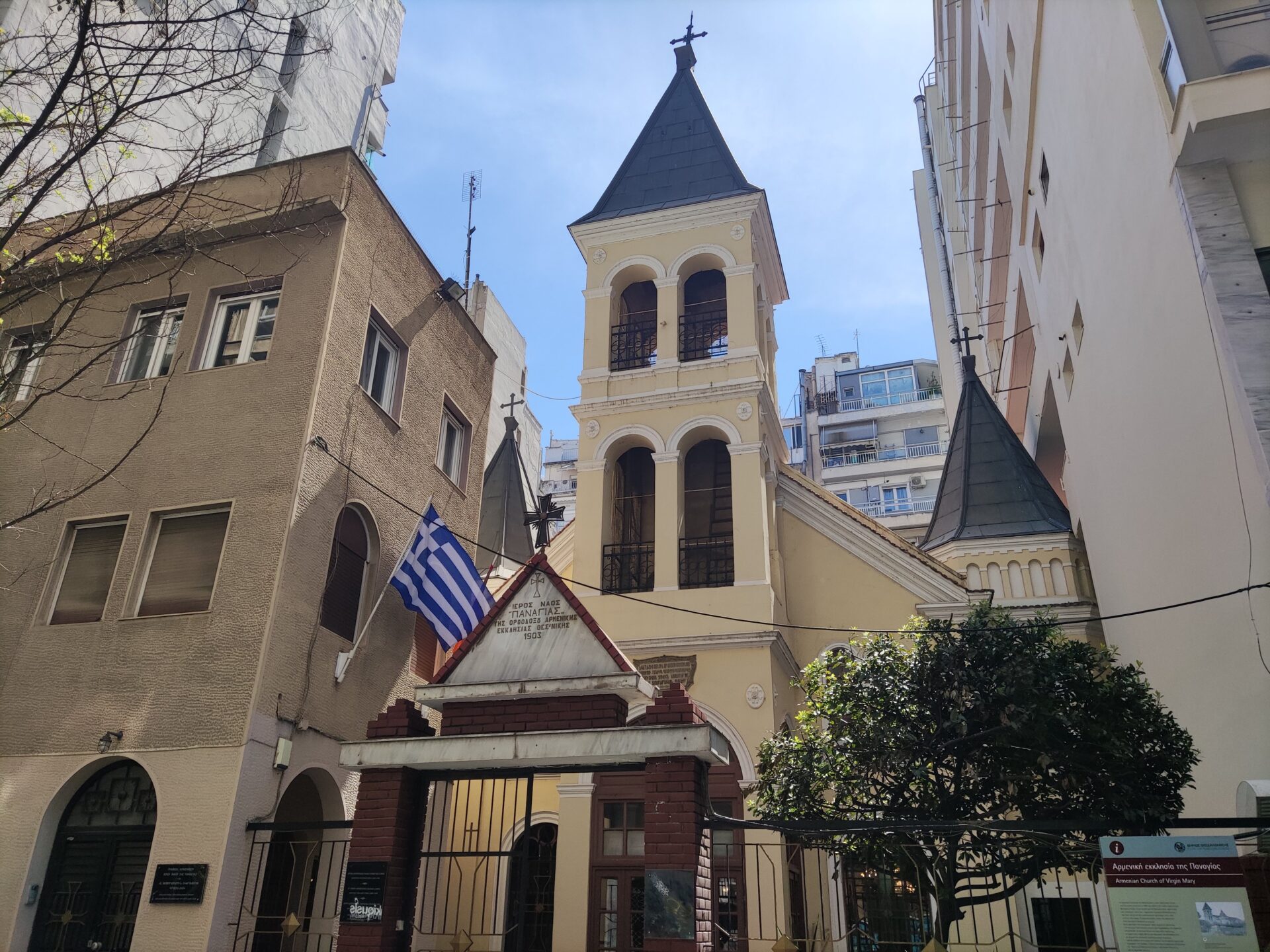 Βρισκόμαστε μπροστά στο ναό της Παναγίας Θεοτόκου των Αρμενίων, την εκκλησία της Αρμενικής Κοινότητας Θεσσαλονίκης που βρίσκεται εδώ από το 1903, σε σχέδια του σημαντικού αρχιτέκτονα Βιταλιάνο Ποζέλι. Είναι η ώρα του κυριακάτικου εκκλησιασμού, που αποτελεί ένα από τα σταθερά τελετουργικά της κοινότητας, άλλοτε από τις πολυπληθέστερες της Θεσσαλονίκης.