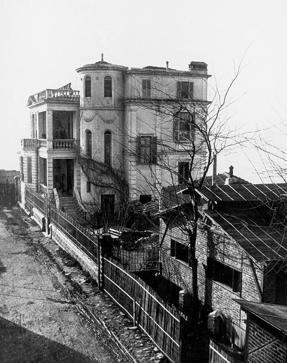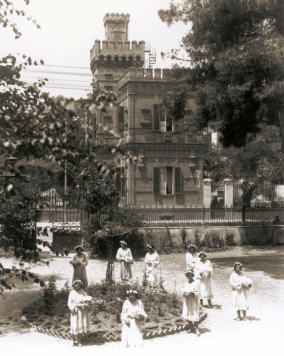 Ο Πύργος της Ευτυχίας από τον κήπο της οικίας Χασά Ασίζ Καπαντζή την εποχή που στέγαζε τα εκπαιδευτήρια Αγλαϊάς Σχινά (περιοχή Ανάληψη)