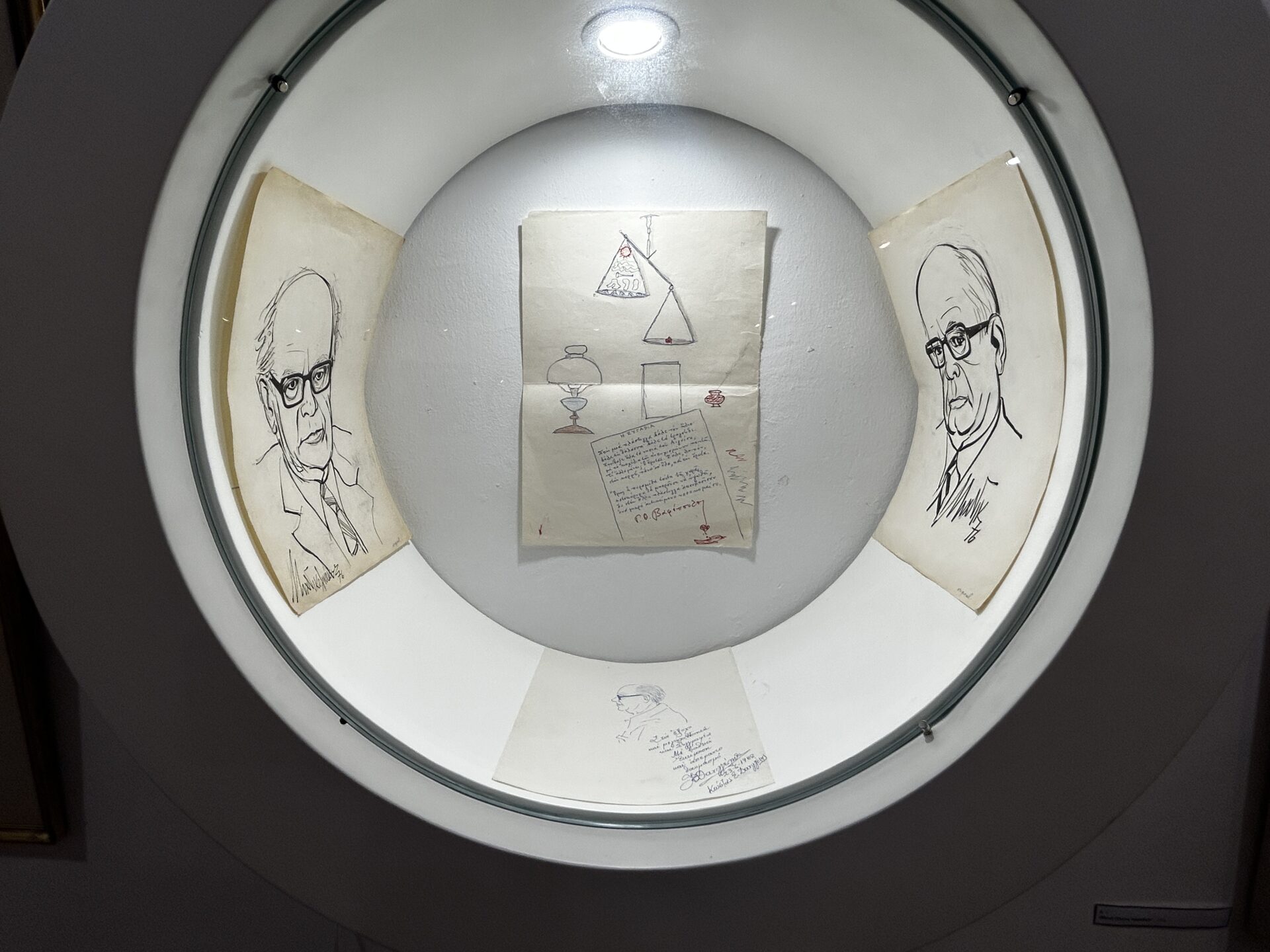 Κάποια αγάλματα, ένα από τα οποία κοσμούσε το γραφείο του, εικόνες με τοπία και ένα χειρόγραφο ποίημα του Βαφόπουλου.