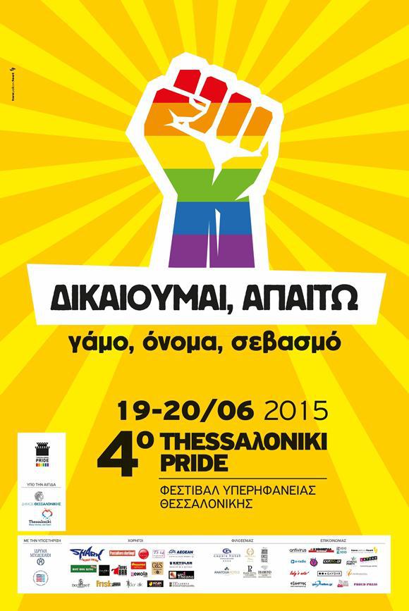 Για τέταρτη συνεχή χρονιά η Θεσσαλονίκη υποδέχεται το Thessaloniki Pride στις 19 και 20 Ιουνίου, με σύνθημα «Δικαιούμαι, απαιτώ γάμο, όνομα, σεβασμό». Η γιορτή της διαφορετικότητας έρχεται στην πόλη μας γι΄ακόμη μια χρονιά πιο ενισχυμένο, με την LGBT κοινότητα να διεκδικεί από τη νέα ελληνική κυβέρνηση, μεταξύ άλλων, τη θέσπιση του πολιτικού γάμου και της τεκνοθεσίας από ομόφυλα ζευγάρια, καθώς και τη νομική αναγνώριση της ταυτότητας φύλου για τα τρανς άτομα. Επίσης, όπως κάθε χρονιά, ψηλά στην ατζέντα των διεκδικήσεων βρίσκεται η άμεση άρση των διακρίσεων με βάση τον σεξουαλικό προσανατολισμό και την ταυτότητα φύλου.