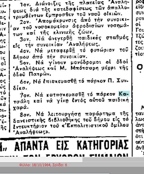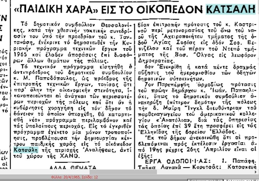 Τον Απρίλιο του 1965 ξανά αποφασίζεται η δημιουργία παιδικής χαρά στο οικόπεδο Κατσάλη, αντί του χώρου της ΧΑΝΘ.
