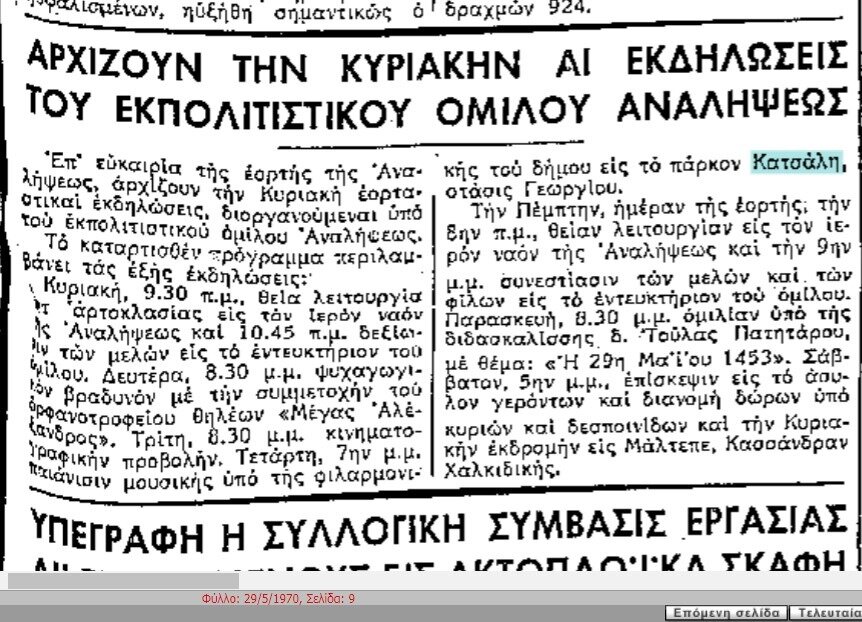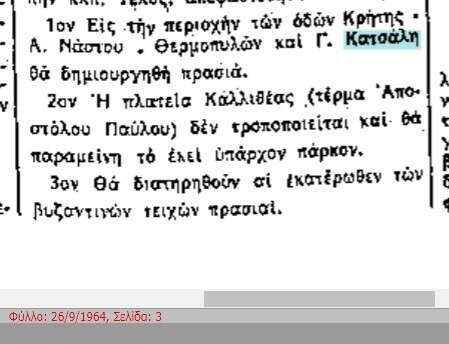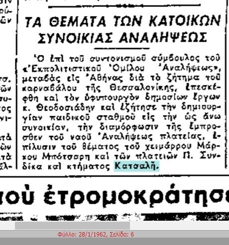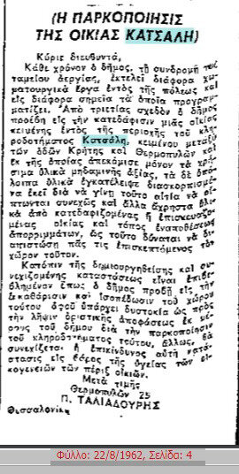 Αρχές του 1962 αναφερόταν ως κτήμα Κατσάλη, δίχως όμως να έχει αποφασιστεί ακόμη η τύχη του.