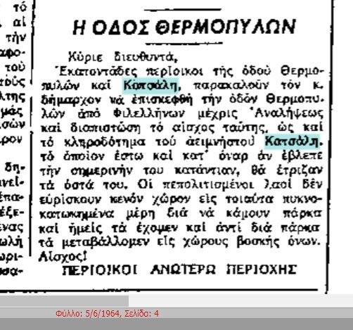 Τον Αύγουστο του 1962 από επιστολή ενός περιοίκου μαθαίνουμε πως η οικία – βίλα Κατσάλη είχε κατεδαφιστεί από εδώ και πέντε χρόνια, από το 1958.