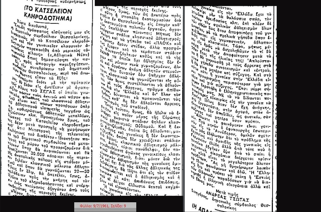 Ο επιστολογράφος θεωρεί ότι οι απόψεις του διαστρεβλώθηκαν από μια αθλητική εφημερίδα, ο ίδιος φίλαθλος όπως ισχυρίζεται (με μια περίεργη τεκμηρίωση για το τι είναι αθλητική συνεισφορά: υπήρξε, λέει, εισηγητής καθιερώσεως αθλητικών μεταλλίων, δεξιώσεων κλπ.).