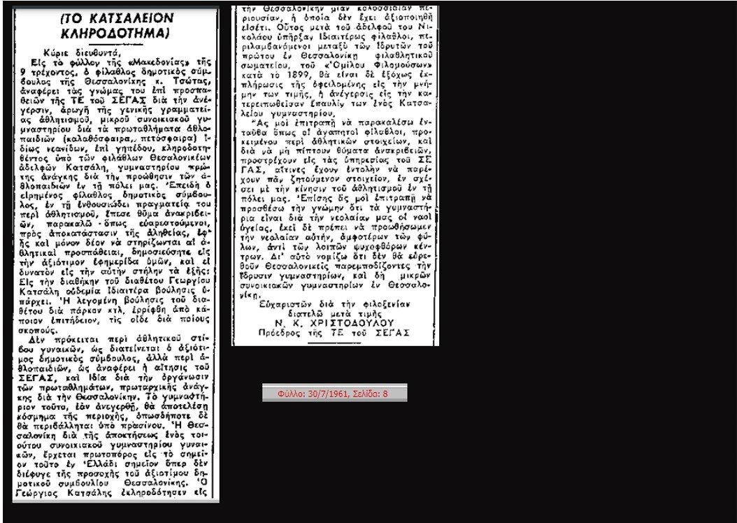 Στην Μακεδονία τον Ιούλιο του 1961 δημοσιεύονται δύο επιστολές που δείχνουν κάποιο παρασκήνιο που αναπτύχθηκε σχετικά με την διάθεση του κληροδοτήματος του Γεωργίου Κατσάλη.